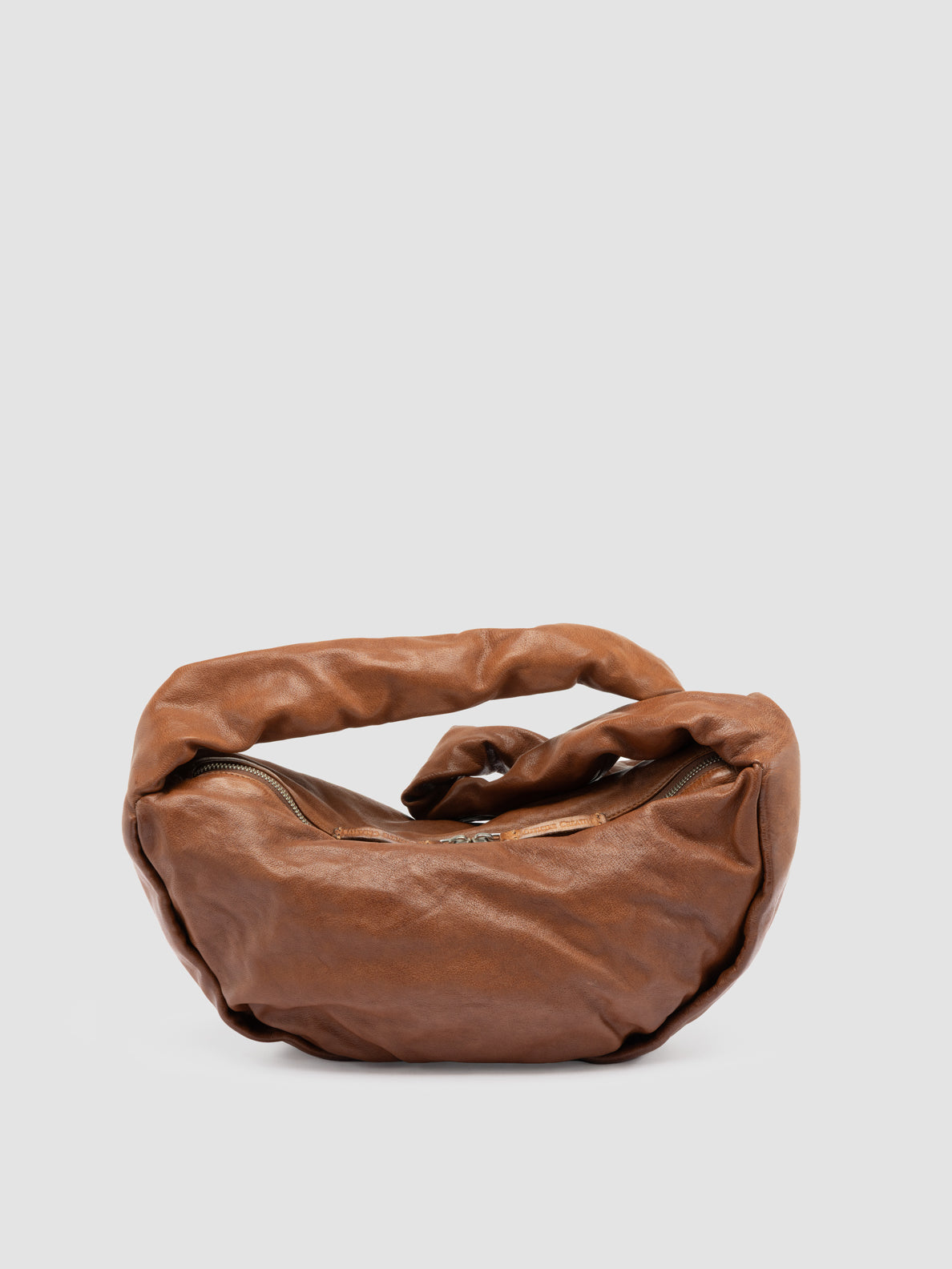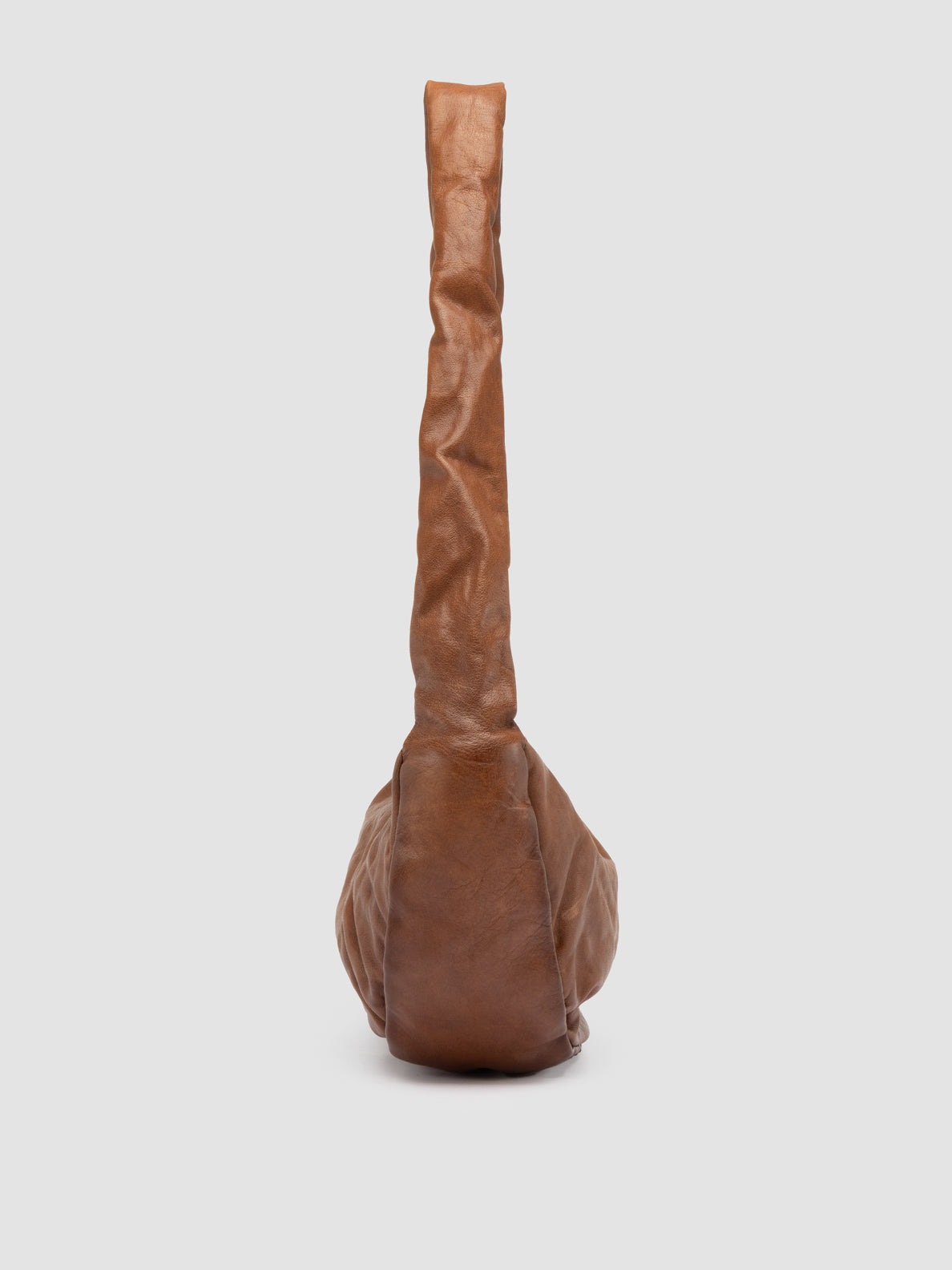 Die „Bolina 046“-Umhängetasche aus braunem Leder präsentiert sich in einer entspannten Silhouette mit einem drapierten Schulterriemen. Das Design betont Minimalismus und Funktionalität und bietet einen geräumigen Innenraum mit Doppelreißverschluss.