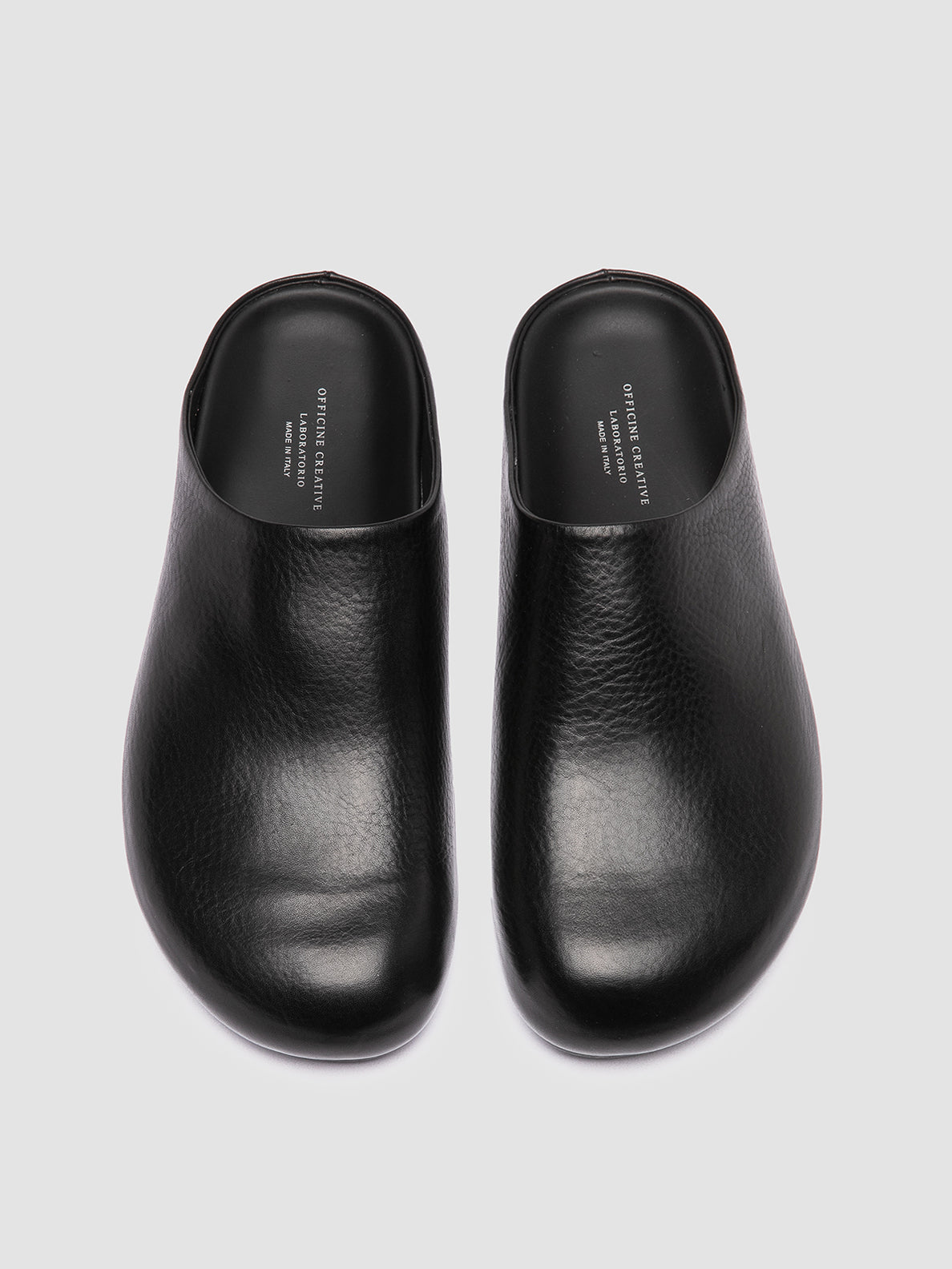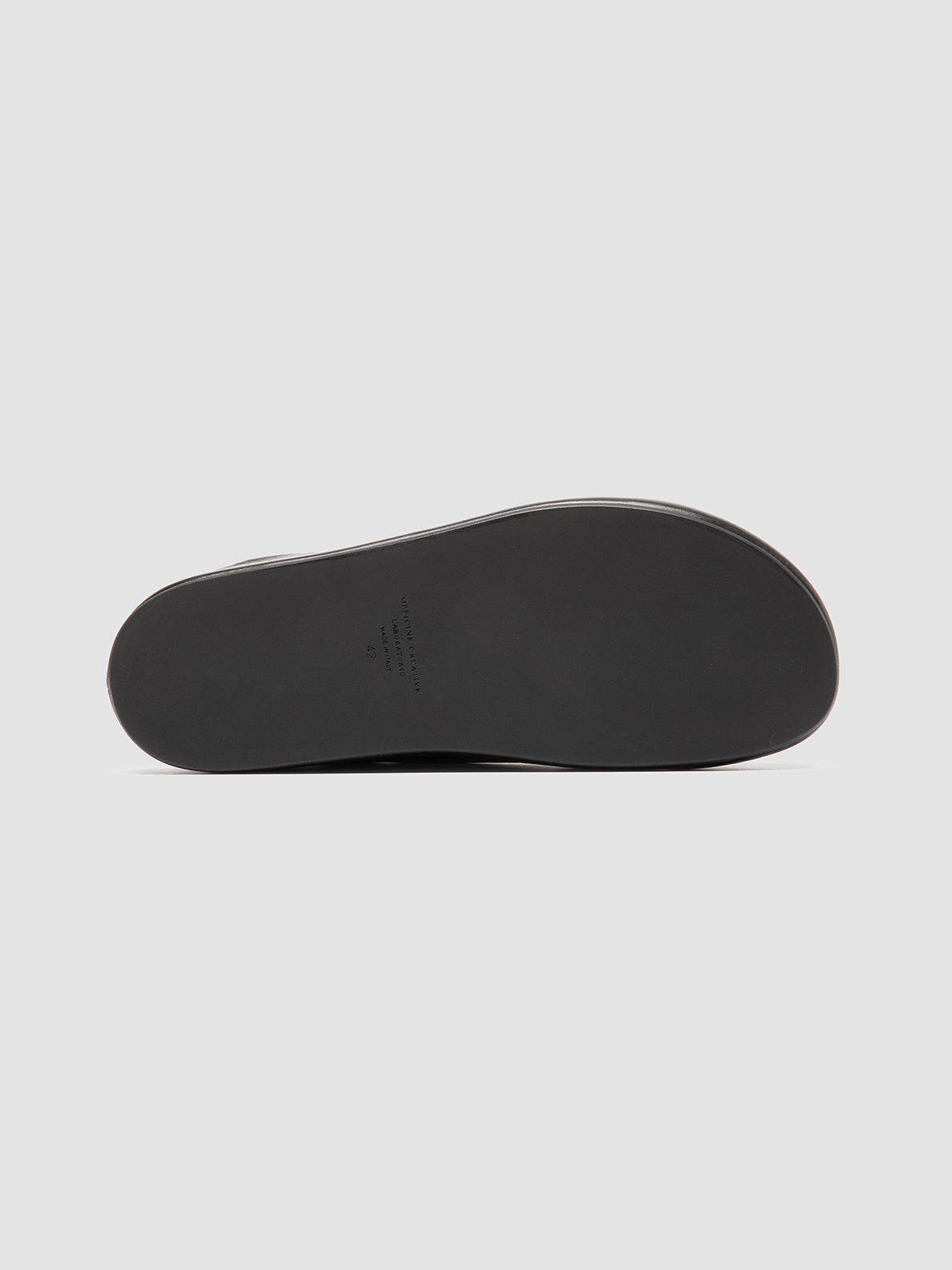 Handcrafted in Italy, the Babouche 001 black sandals exemplify minimalist elegance with a sleek, single-piece construction. The encased design in supple suede wraps seamlessly around the foot, complemented by a rubber sole.