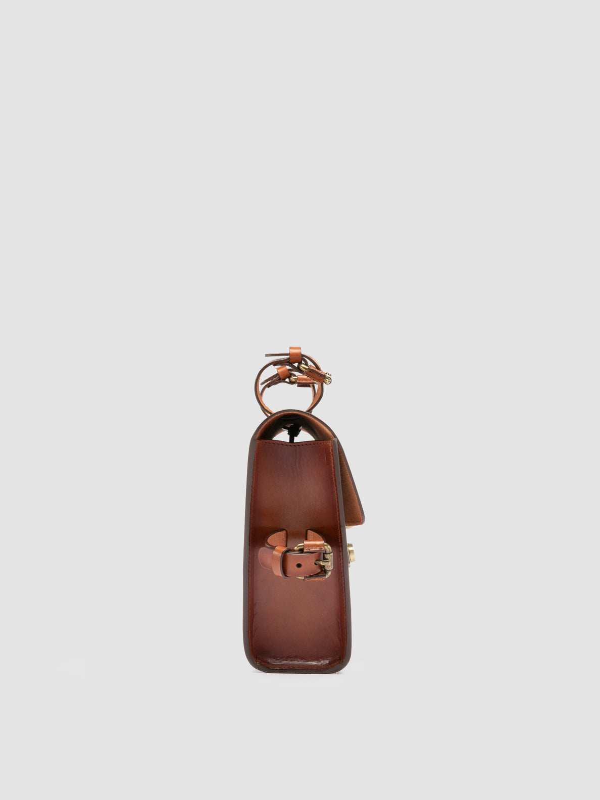 Die Tasche „OC Bike 001“ ist eine handgefertigte Tasche aus braunem Glattleder, die Funktionalität mit Stil verbindet. Sie wurde für Radfahrer entwickelt und verfügt über verstellbare Lederriemen für eine sichere Befestigung und eine strukturierte Form mit einem messingfarbenen Druckverschluss.