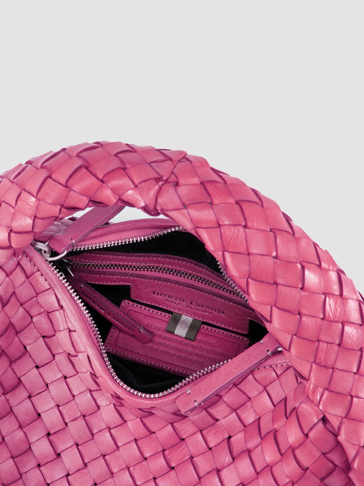 Crafted in Italy, the Bolina 144 bag in pink leather features a handwoven silhouette with a sculptural, thick handle. Lined in soft suede, the spacious interior secures with a double-zip closure, mixing elegance and function.