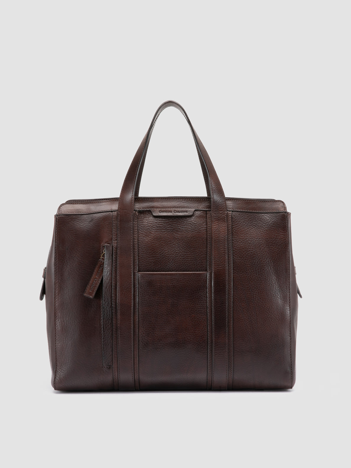 Die elegante und praktische Aktentasche „Rare 049“ ist aus feinem, braunem Leder handgefertigt und verfügt über ein stoffgefüttertes Hauptfach, Tragegriffe an der Oberseite und einen Schulterriemen. Eine Vordertasche und antike goldfarbene Beschläge runden das Design ab.