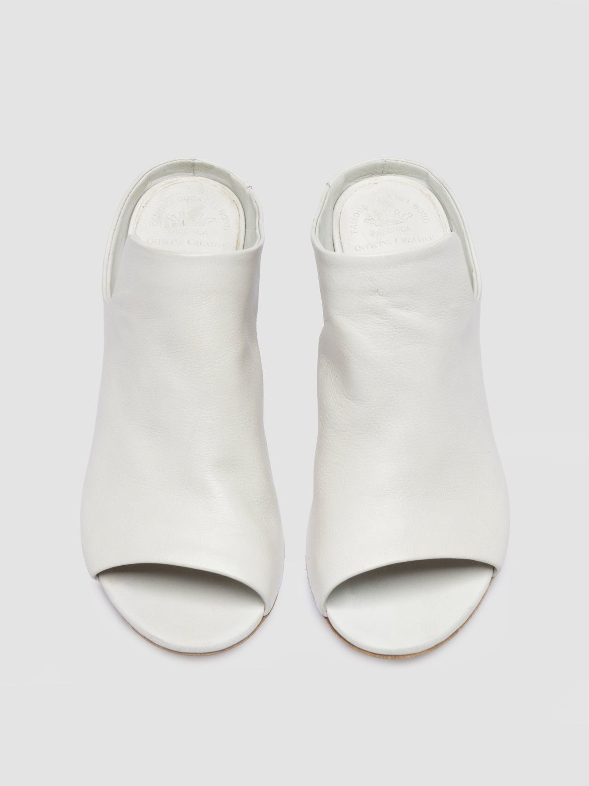 Handcrafted in Italy, the Adele 003 slide sandals combine a sculpted design with a soft white leather upper. The open toe and stacked mid-heel create a clean, contemporary profile with a subtle retro touch.