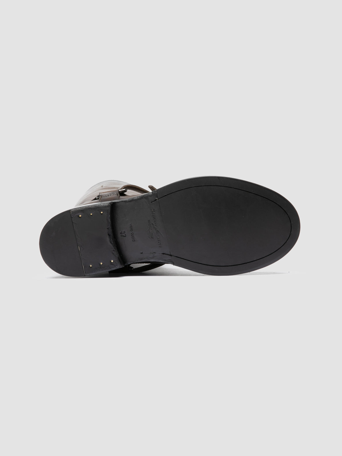 Die Stiefel „Beryl 010“ sind aus taupefarbenem, mit Airbrush verziertem Leder handgefertigt. Sie sind zum Hineinschlüpfen, haben einen hohen Schaft und einen Riemen im Biker-Stil. Die Ledersohle ist mit Gummieinsätzen verstärkt, um die Trittsicherheit zu erhöhen.