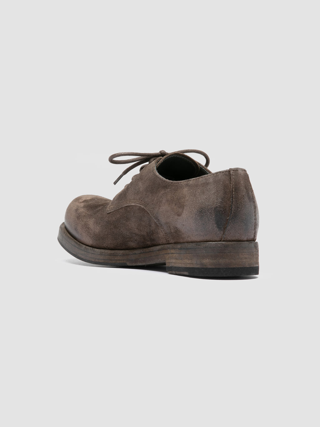 Die Derby-Schuhe „Bulla DD 311“ werden in Italien aus gewachstem taupefarbenem Wildleder handgefertigt und tief gefärbt, um die satte Textur hervorzuheben. Eine Ledersohle mit Gummieinsatz und eingravierter Poesie sorgt für Langlebigkeit und einen künstlerischen Touch.