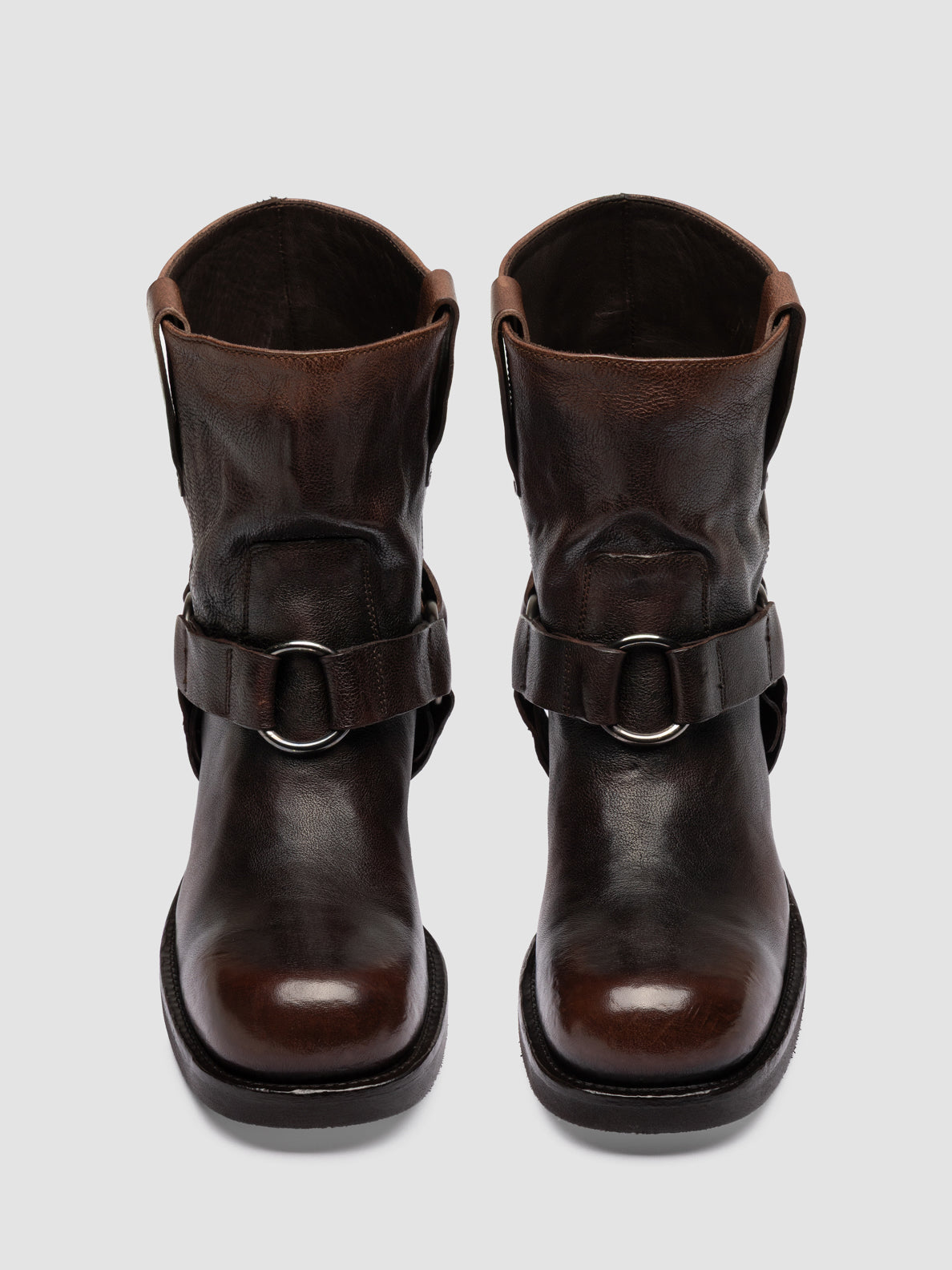 The Dana 003 boots are handcrafted from waxed airbrushed brown leather, featuring a pull-on silhouette enhanced by a harness strap and metal ring detail. A sturdy stacked heel provides stability, while the lightweight EVA sole ensures all-day comfort.