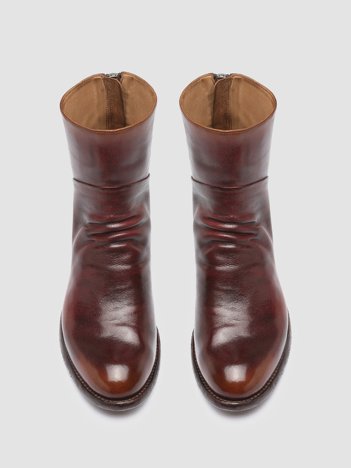 The exclusive airbrushed finish in tobacco and burgundy tones makes our Lison ankle boots unique and inimitable. They are handmade from fine smooth leather and reveal a comfortable silhouette with rounded toe soft front pleats back zip fastening and leather sole with a low stacked heel and commando rubber pads.