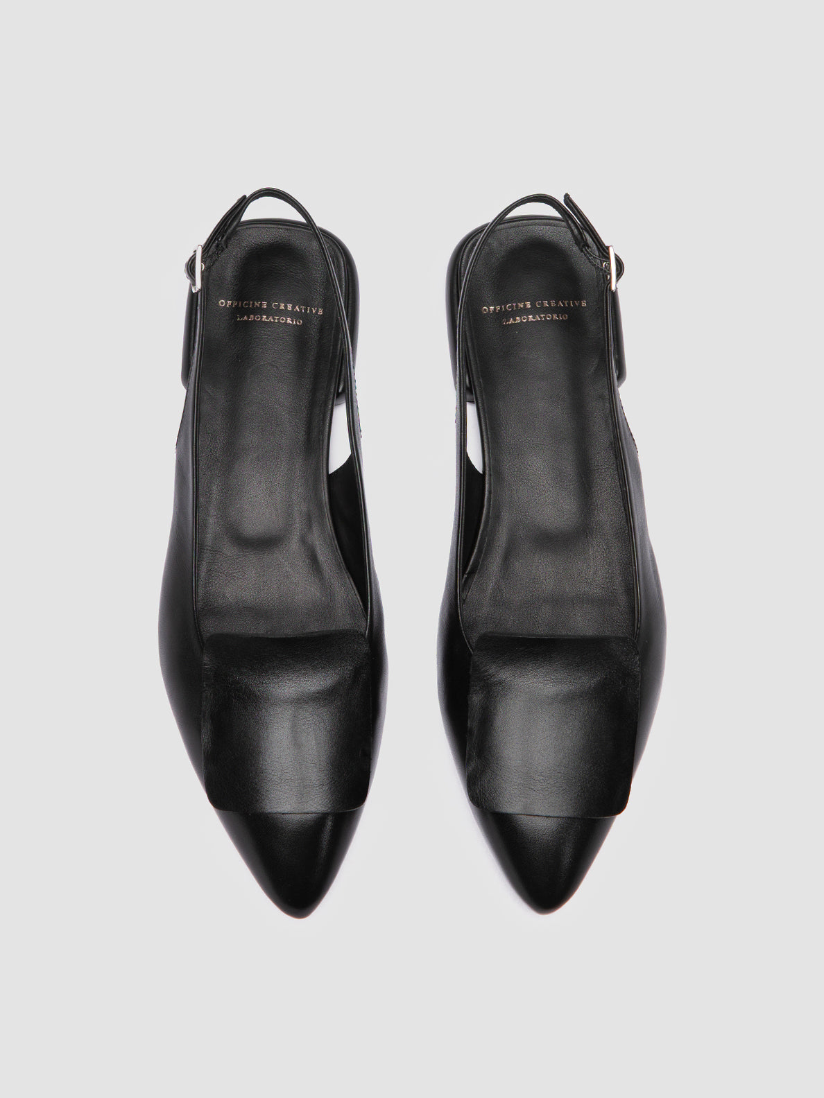 The Sue 007 slingback sandals in black leather combine elegance with a modern edge. They feature a pointed toe and a signature front flap detail, while the strap and low inverted heel offer sophistication and comfort.
