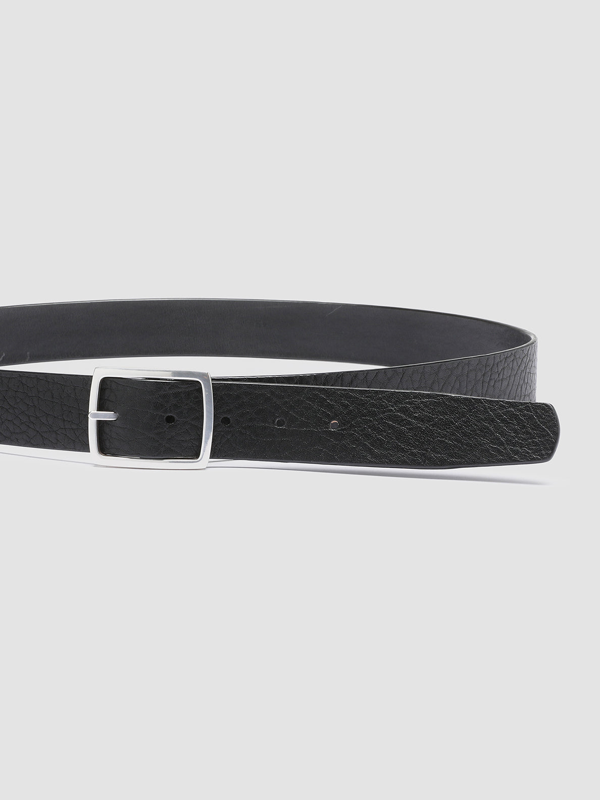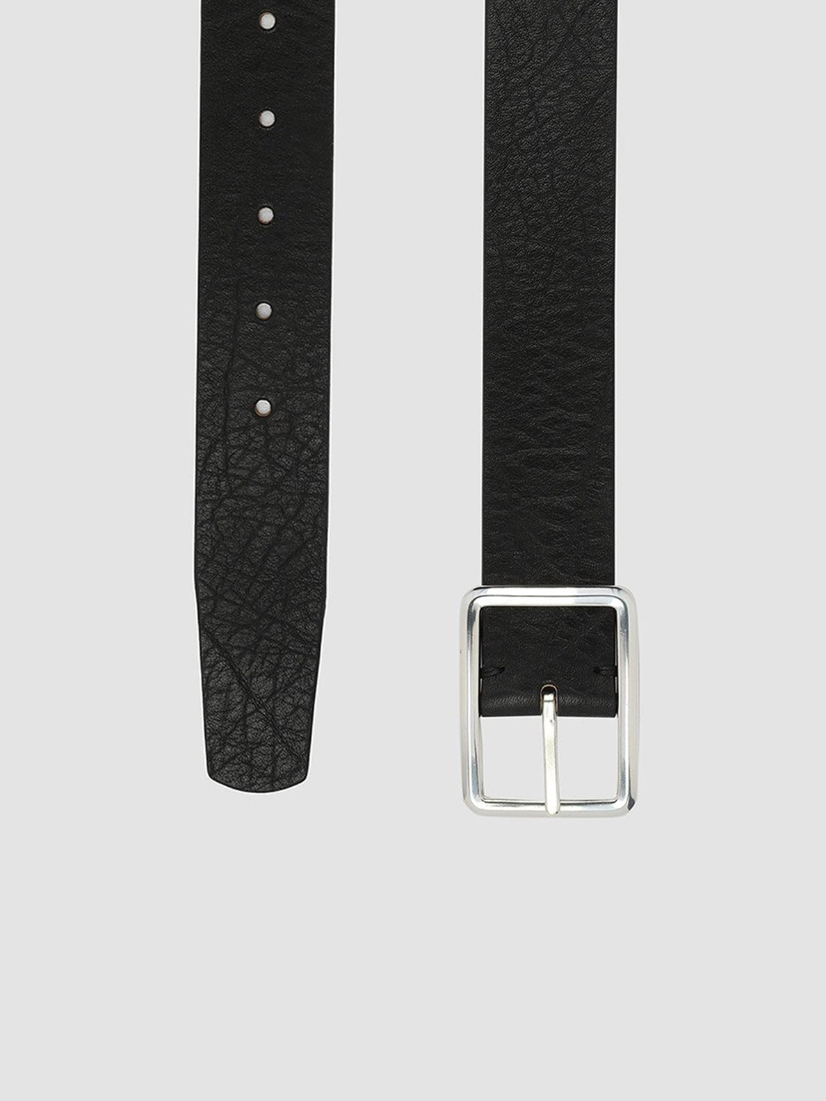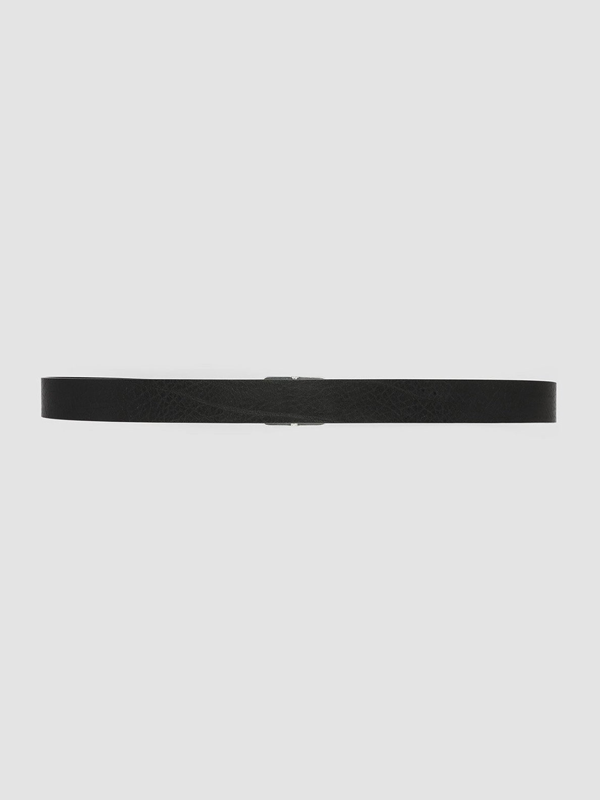 Ein kühner Ausdruck zeitgenössischen Designs. Der Gürtel „OC Strip 10“ ist handgefertigt aus schwarzem Leder mit einer unverwechselbaren strukturierten Oberfläche und einer quadratischen, silberfarbenen Metallschnalle für eine elegante, minimalistische Ästhetik.