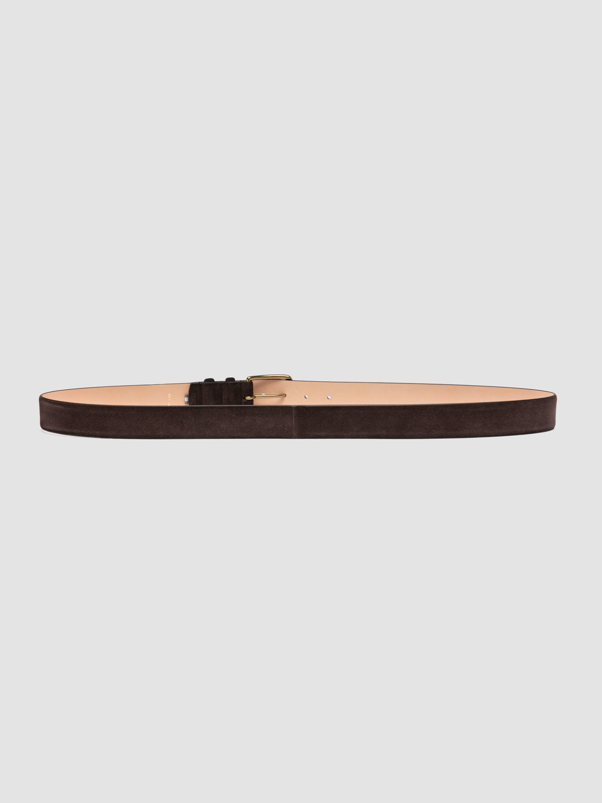Unser Gürtel „OC Strip“ in einem raffinierten dunkelbraunen Farbton ist aus Wildleder handgefertigt und zeichnet sich durch eine quadratische Schnalle aus goldfarbenem Metall mit Logodruck auf der Innenseite und die charakteristische Ripsbandschlaufe aus. Perfekt für jeden Tag mit lässigen und eleganten Styles.