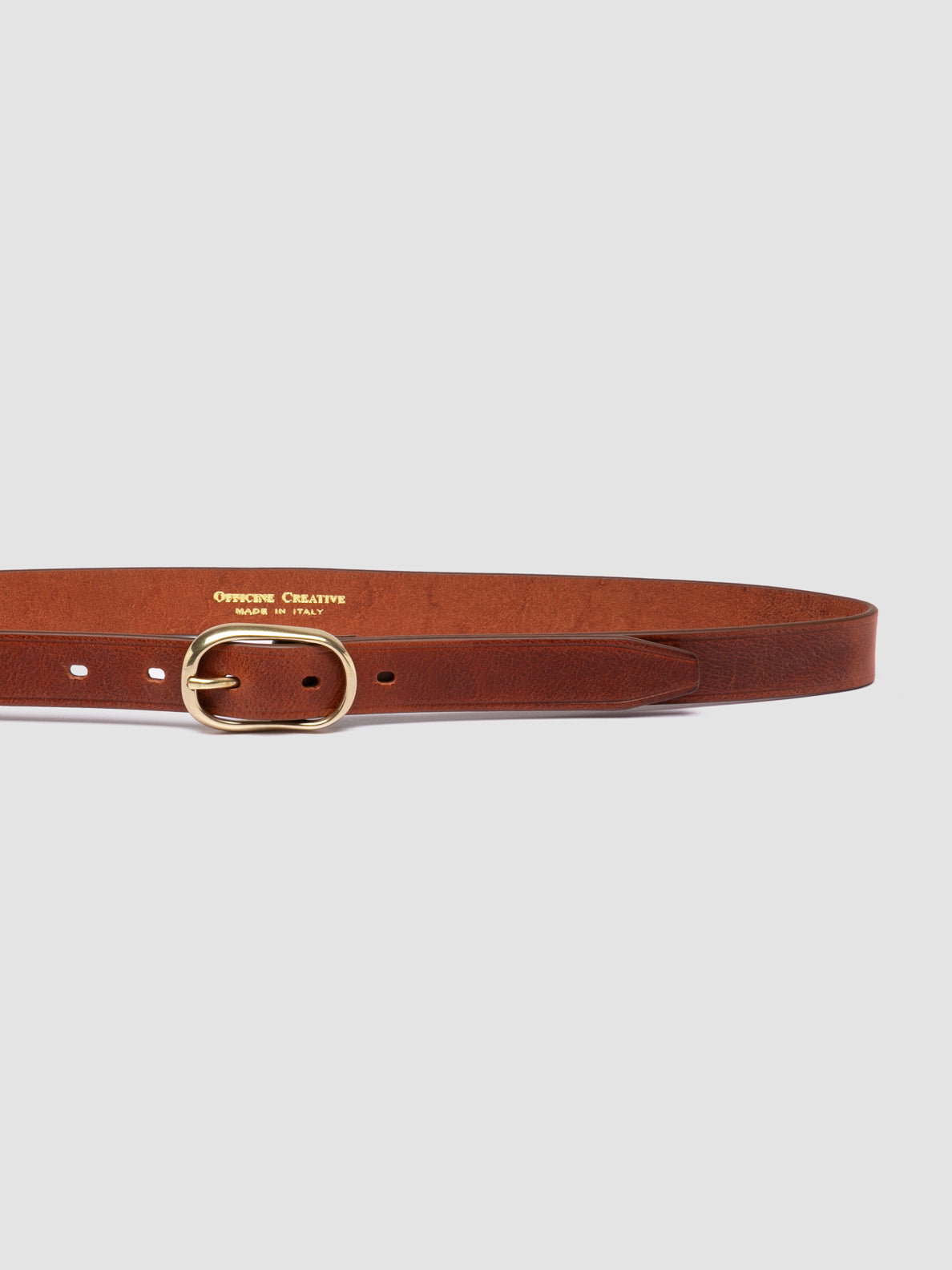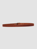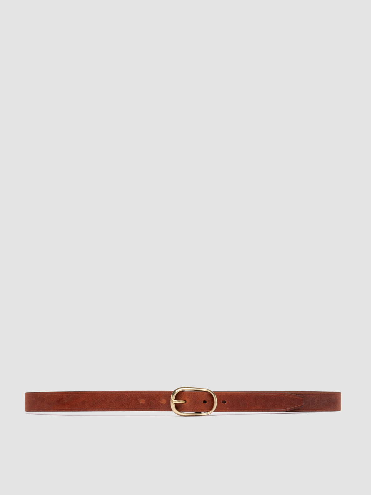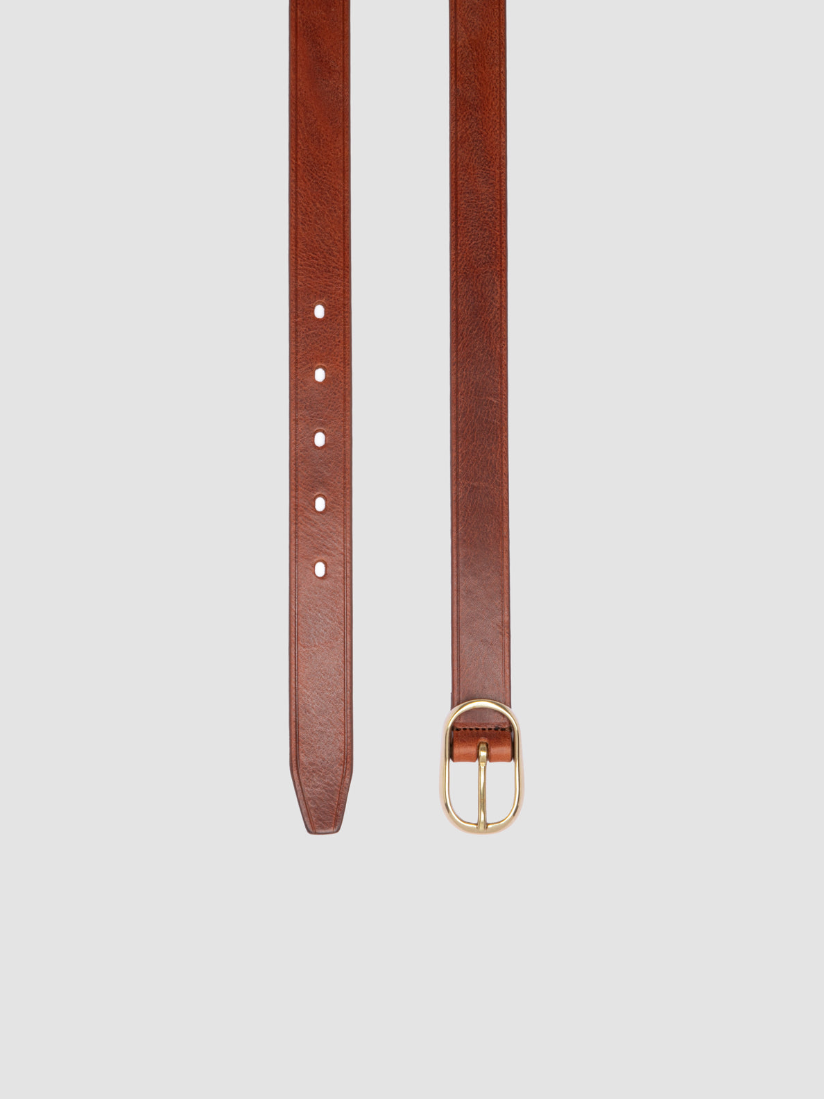 Der Gürtel „OC Strip 099“ ist handgefertigt aus dunkelbraunem Leder mit einer glatten, dezent strukturierten Oberfläche, die seine raffinierte Ausstrahlung unterstreicht. Eine goldfarbene Metallschnalle sorgt für einen zeitlosen Touch, während die Innenseite mit einem dezenten Logo verziert ist.