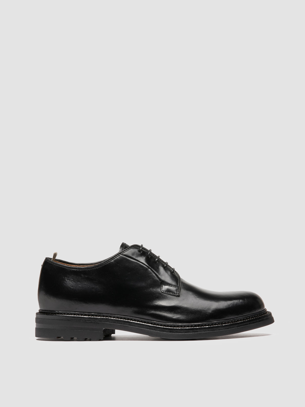 Der „Aston Flexi 001“ ist eine einzigartige Neuinterpretation des klassischen Derbys. Er hat einen übergroßen Leisten und einen verlängerten Absatz. Er ist aus weichem schwarzem Leder handgefertigt und hat eine einteilige Innensohle aus Leder und eine Laufsohle aus Gummi.