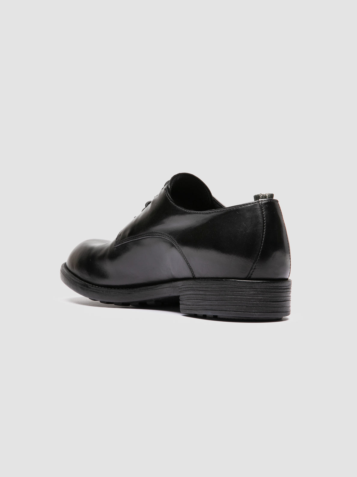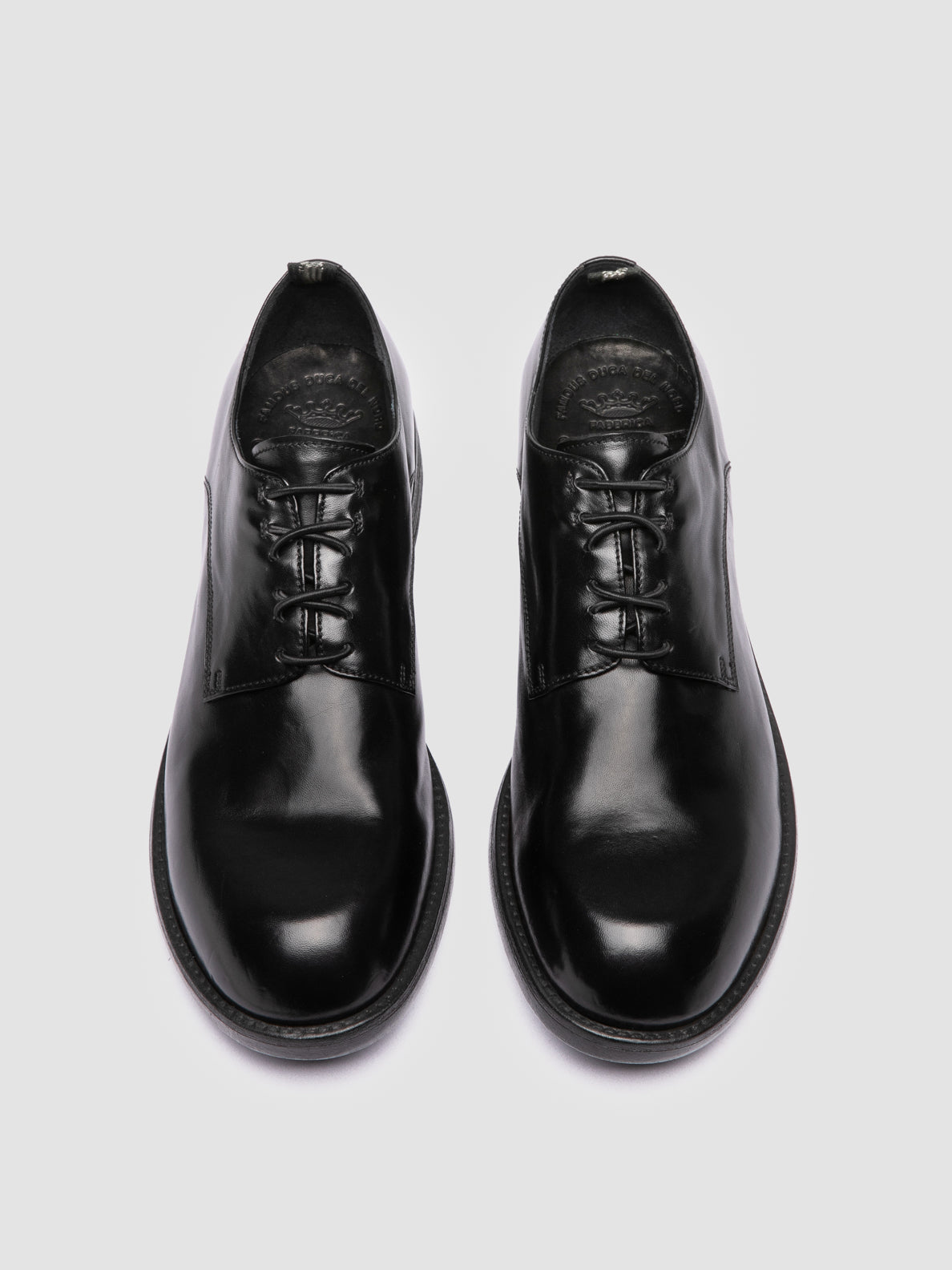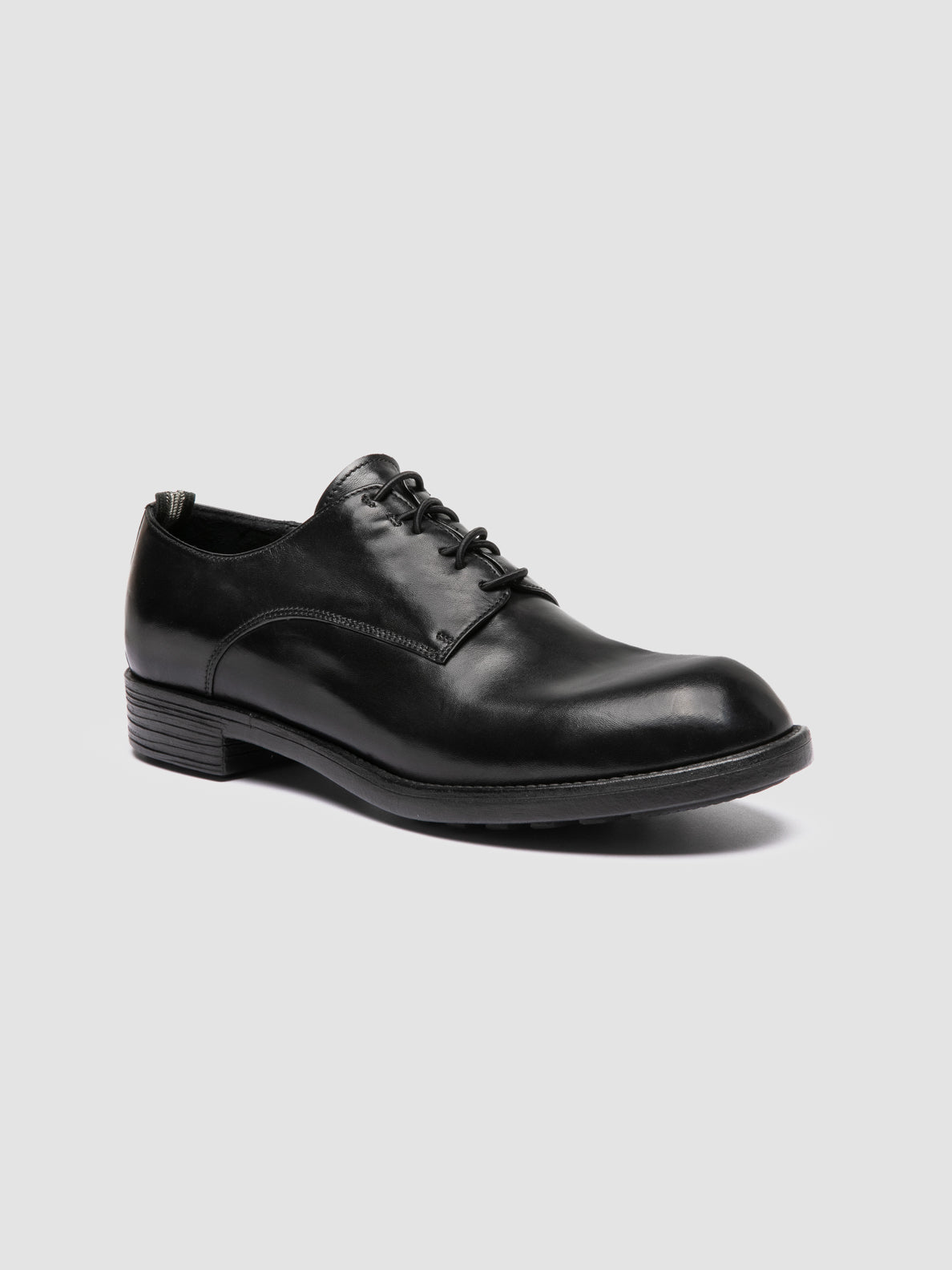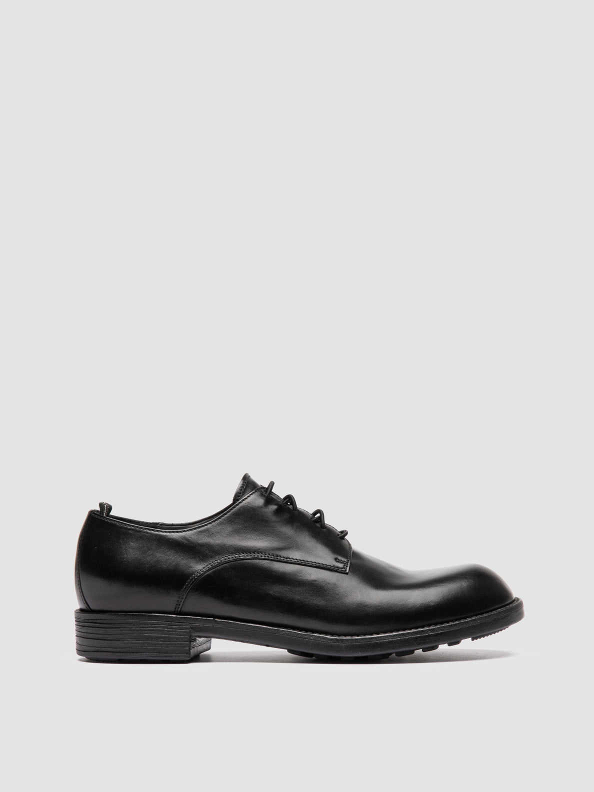 Die Derby-Schuhe „Diary 009“ sind aus tiefschwarzem Leder handgefertigt und haben ein durchgefärbtes Finish. Sie zeichnen sich durch eine strukturierte Silhouette, eine klassische Schnürung und eine robuste Gummisohle für den Alltag aus.