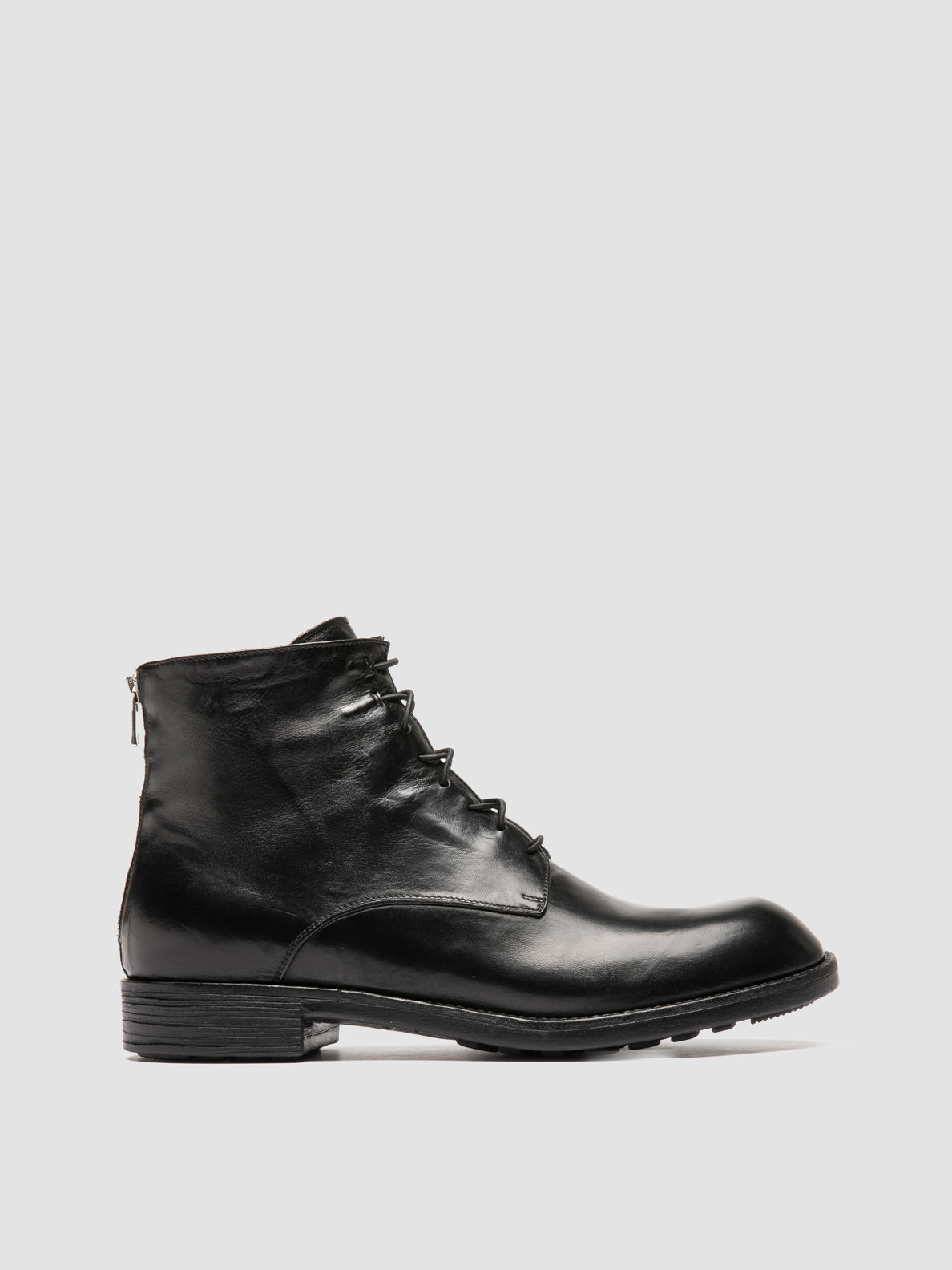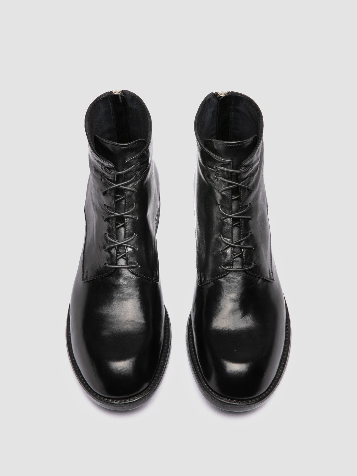Die Stiefel „Diary 010“ sind aus tiefschwarzem Leder handgefertigt und haben ein poliertes Finish. Sie verfügen über eine Schnürung an der Vorderseite für einen sicheren Sitz, einen Reißverschluss an der Rückseite für ein einfaches Anziehen und eine Gummisohle für Komfort und Haltbarkeit.