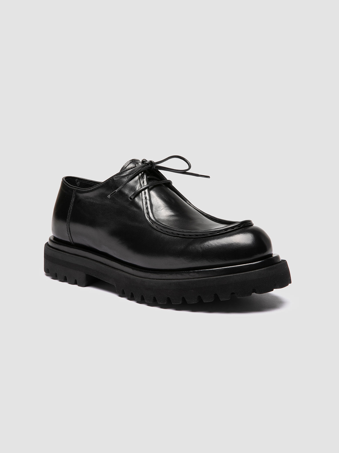 Die Derby-Schuhe „Eventual DD 109“ sind eine gewagte Neuinterpretation des Wallabee-Stils und bestechen durch ihre skulpturale Silhouette und das tiefschwarze Leder. Die ultraleichte Profilsohle aus EVA sorgt für Komfort und Bewegungsfreiheit.