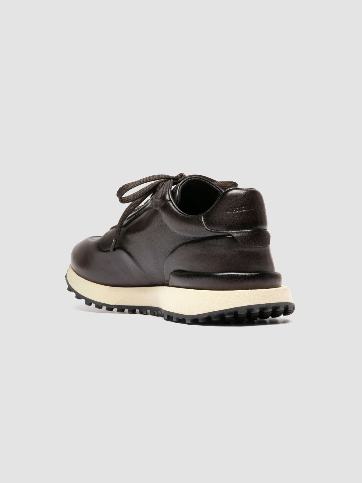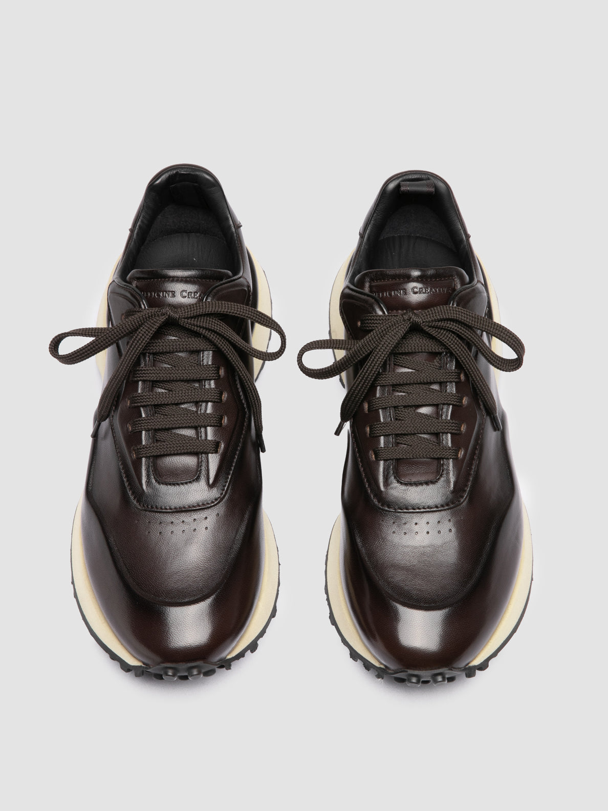 Die Sneakers „Kenyan 001“ sind eine Studie in Minimalismus, handgefertigt aus braunem Leder mit einem nahtlosen, geformten Design. Das Fehlen traditioneller Nähte unterstreicht die schlanke Silhouette, während die EVA-Sohle für mühelose Bewegung sorgt.
