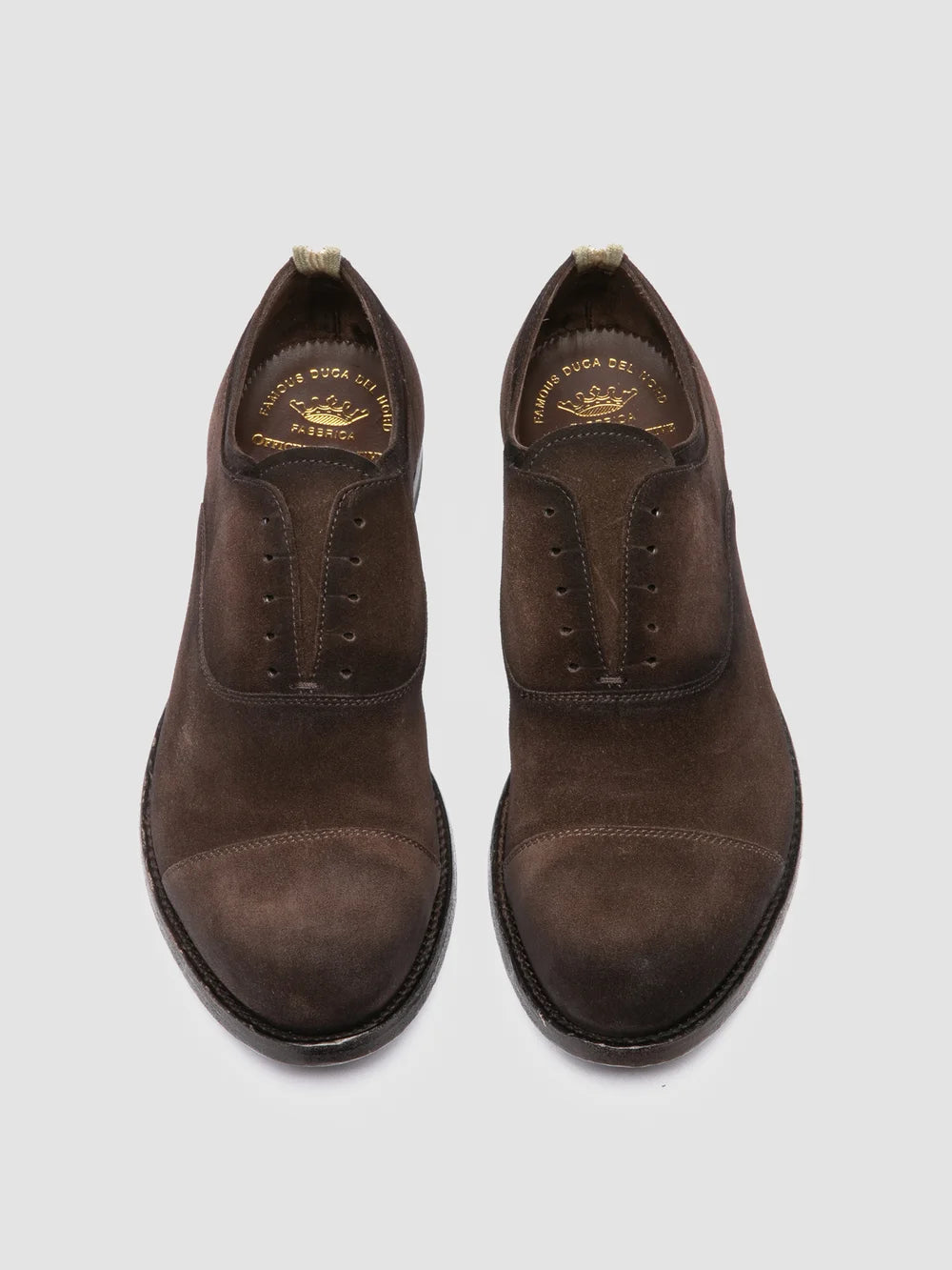 Thanks to the exclusive airbrushed finish and the sleek laceless design our Anatomia oxford shoes stand out from all others. They are crafted from soft and precious dark brown suede with a refined shaded effect and are defined by the leather sole applied by hand with stacked heel and by our signature grosgrain heel pull tab.