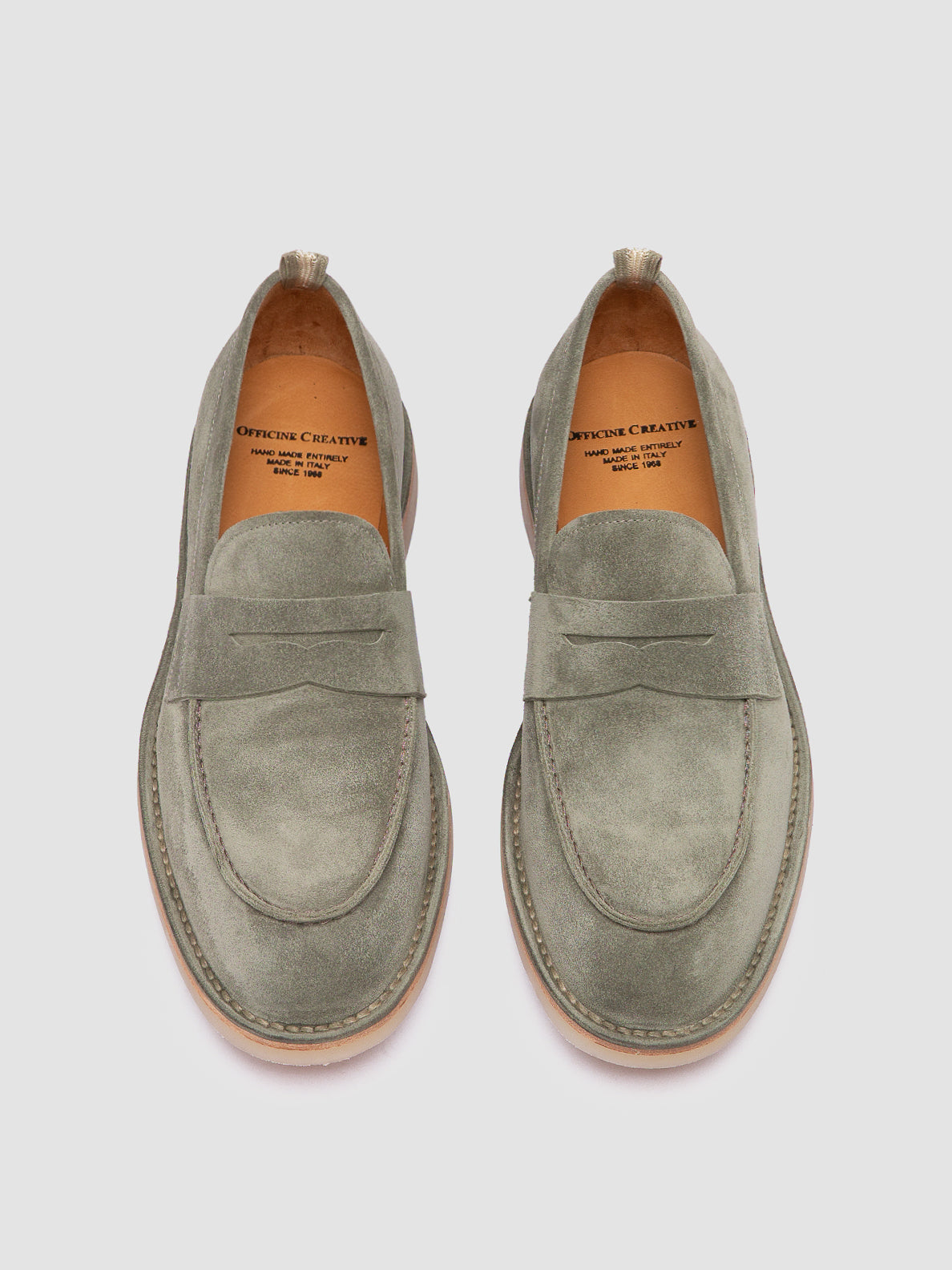 The Flexus 002 in soft green suede bring a contemporary touch to the classic penny loafer style. Handcrafted in Italy, these loafers feature a comfortable and durable natural rubber sole that offers flexibility and grip.
