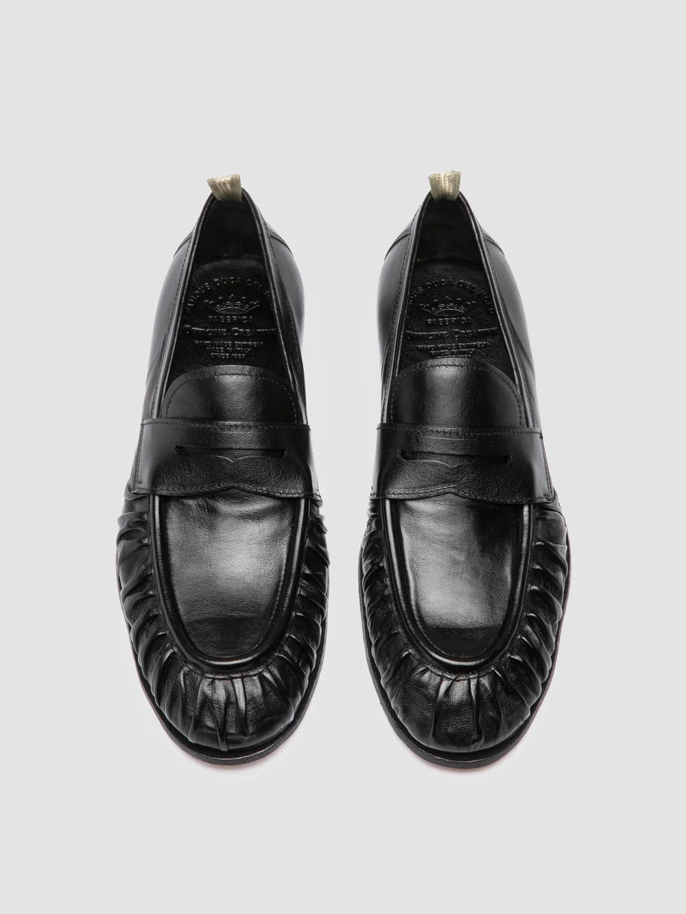 The Solitude 015 loafers revisit a timeless silhouette with a distinctive edge. Handcrafted in Italy from polished black leather, they feature a ruched apron detail that adds depth and movement. A leather sole completes the design.