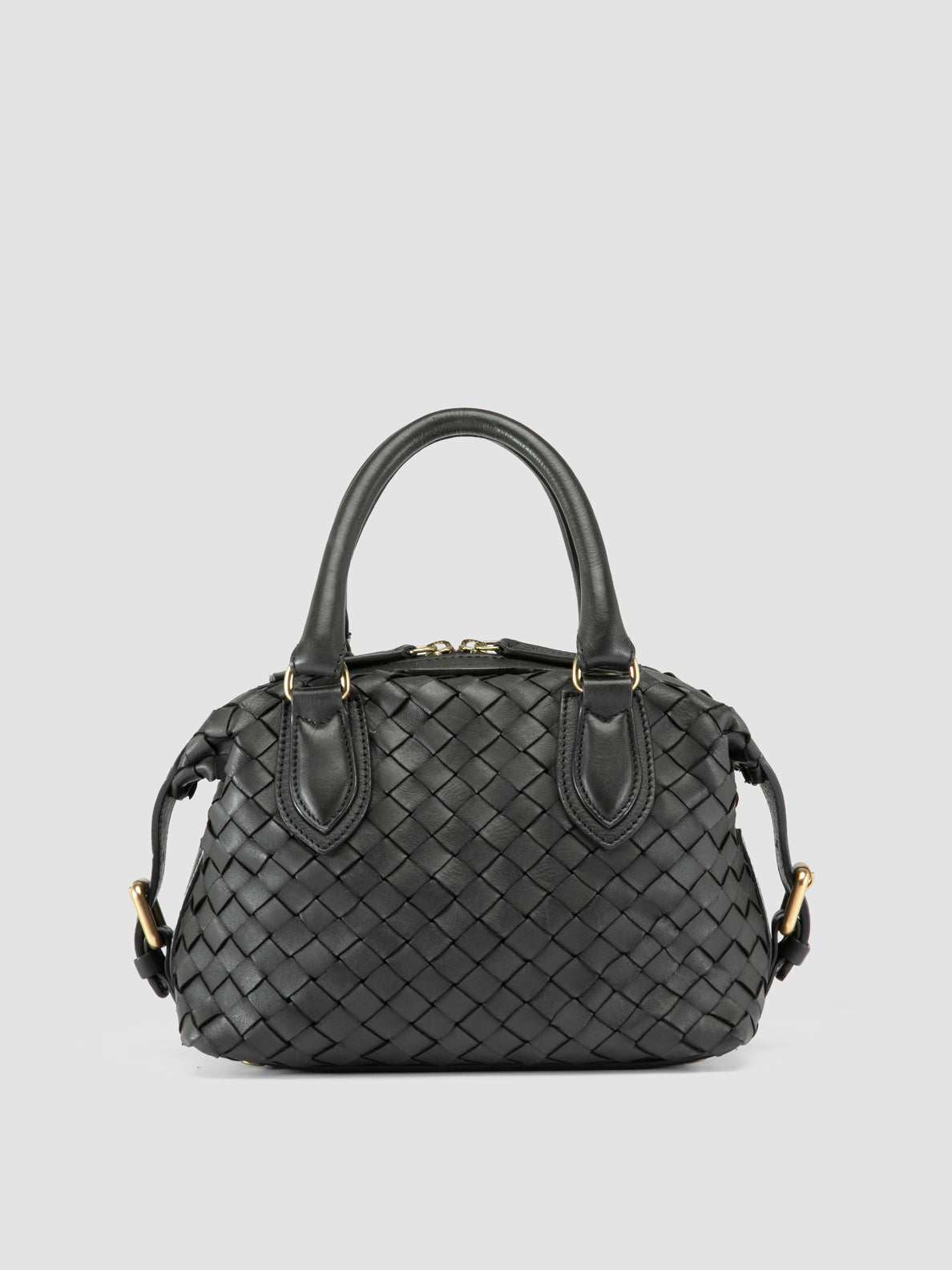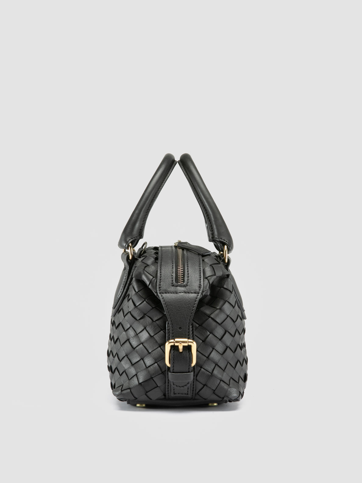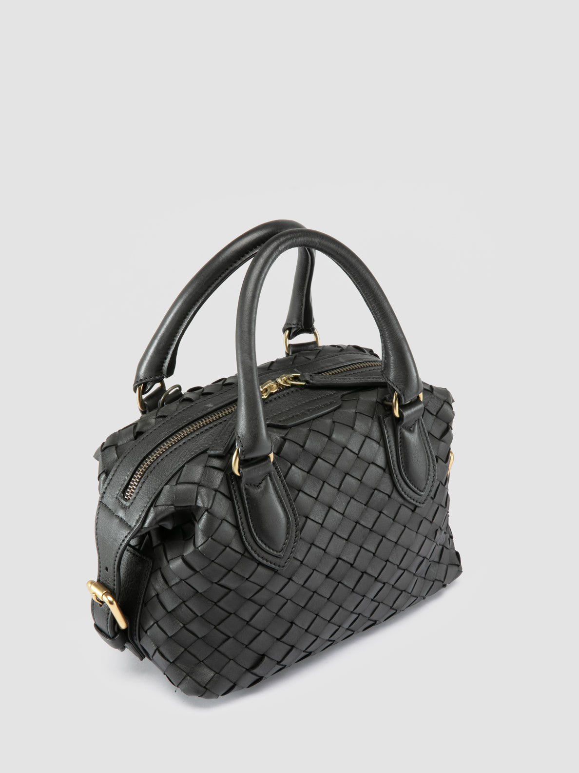 Crafted from handwoven black leather, the Aura 002 features a compact yet spacious design with top handles and a detachable shoulder strap. The zip closure secures essentials, while the fabric-lined interior includes practical pockets.