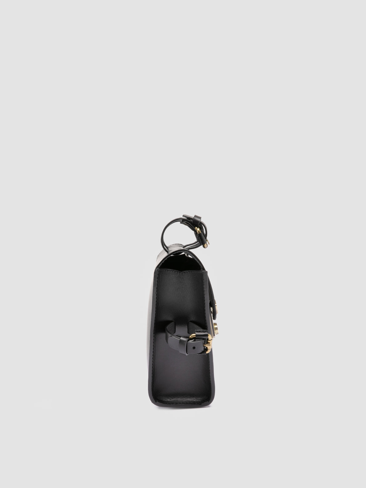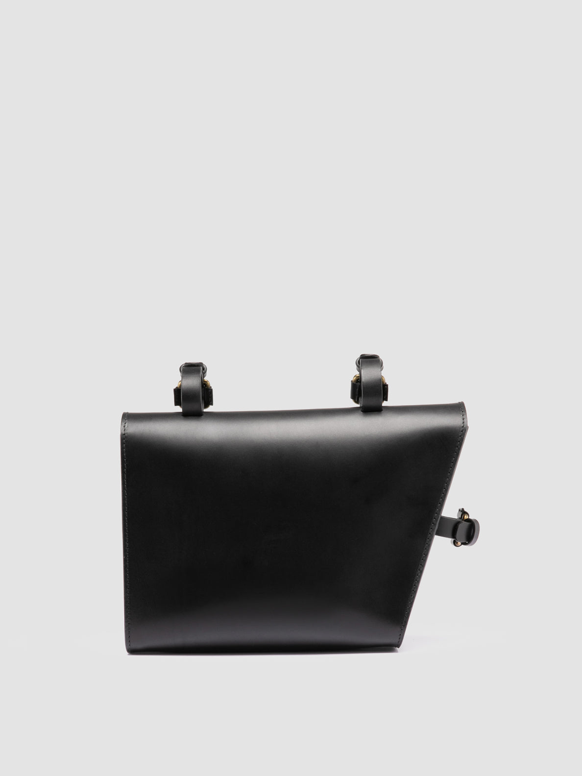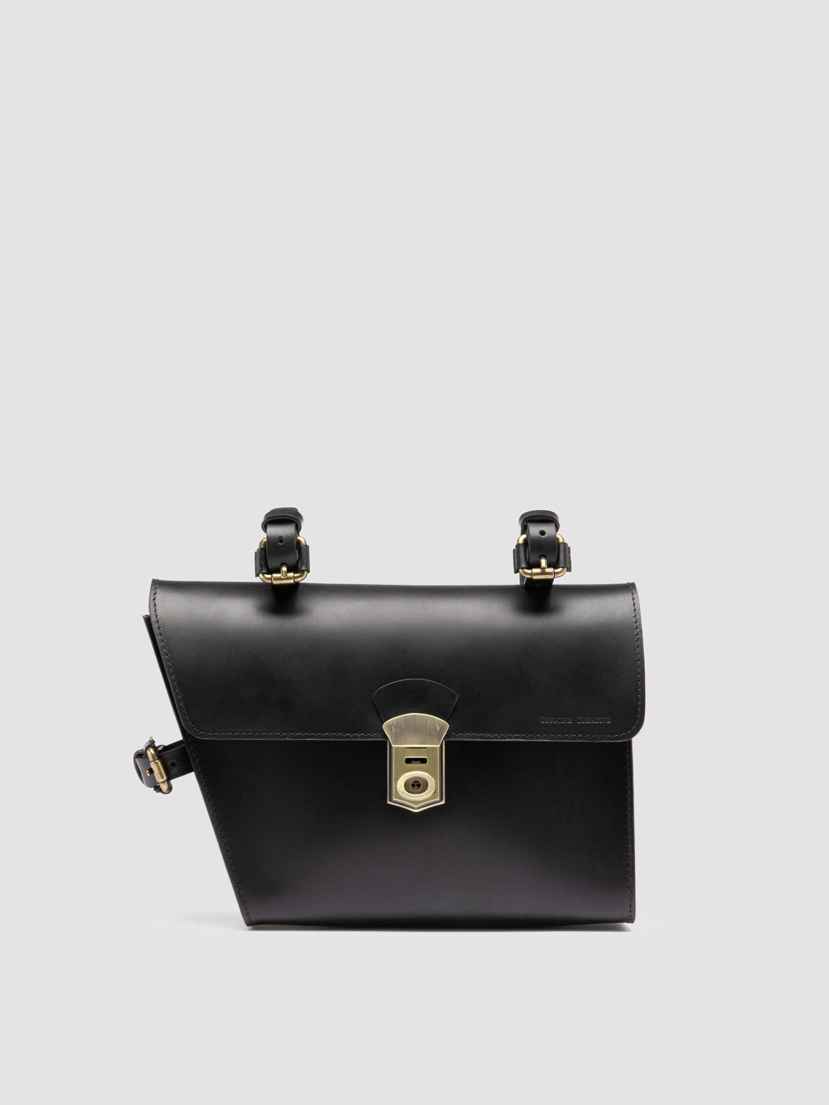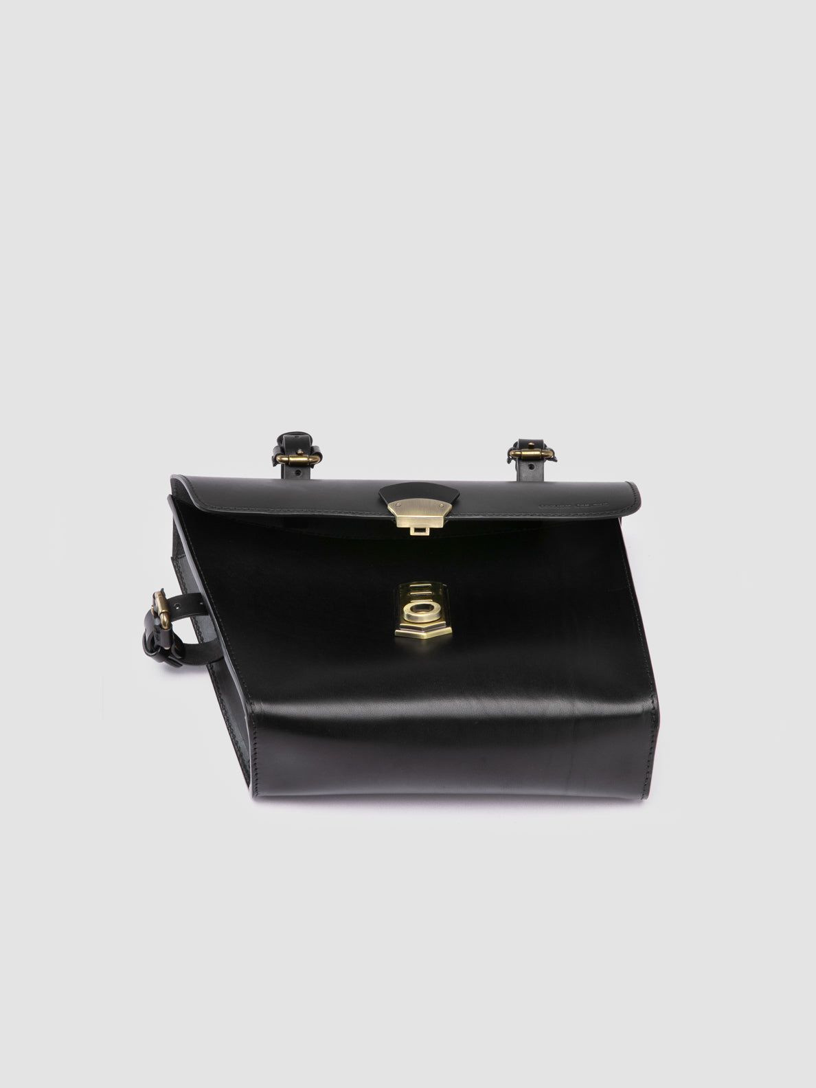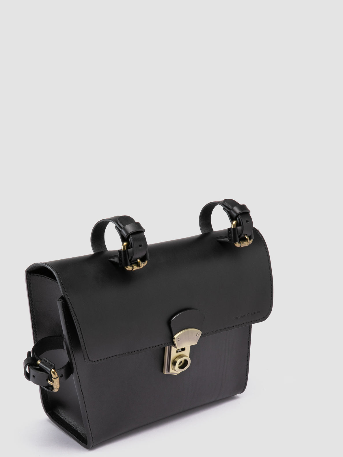 Handcrafted from smooth black leather, the OC Bike 001 bag blends function with style. Designed for cyclists, it features adjustable leather straps for secure attachment and a structured shape with a brass-tone push-lock closure.