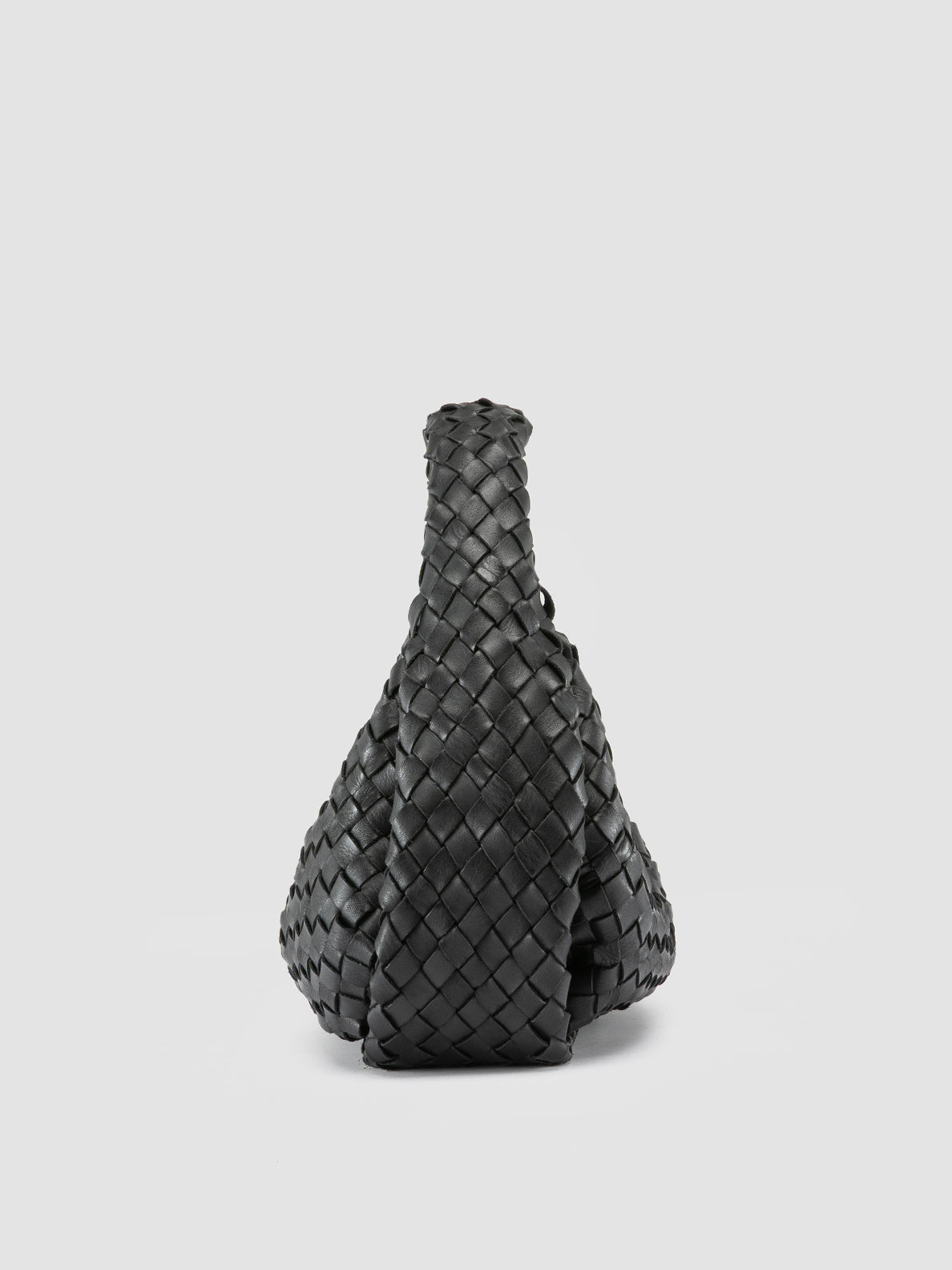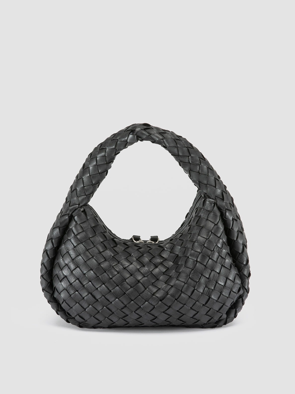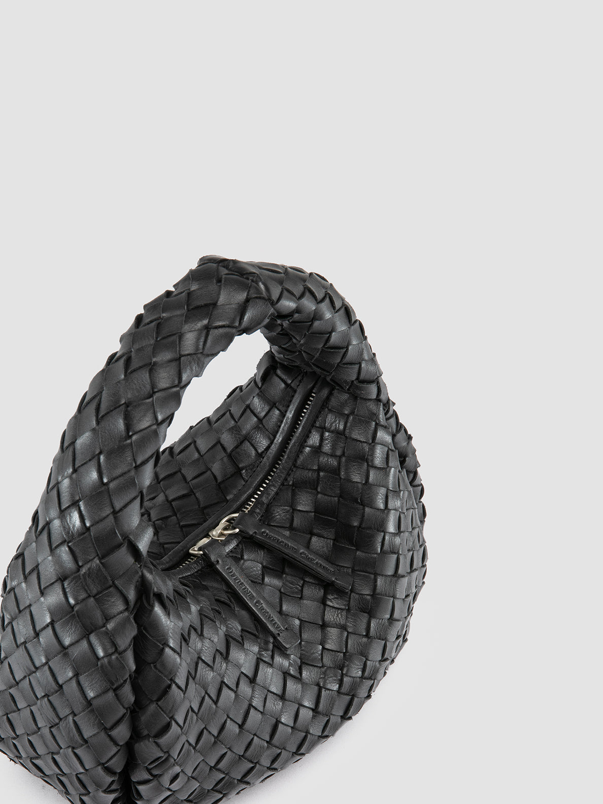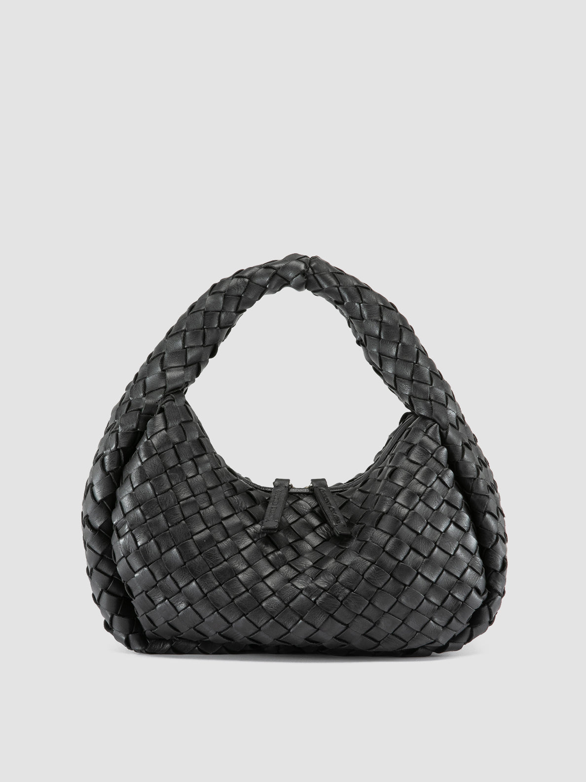 Crafted in Italy, the Bolina 144 bag in black leather features a handwoven silhouette with a sculptural, thick handle. Lined in soft suede, the spacious interior secures with a double-zip closure, mixing elegance and function.