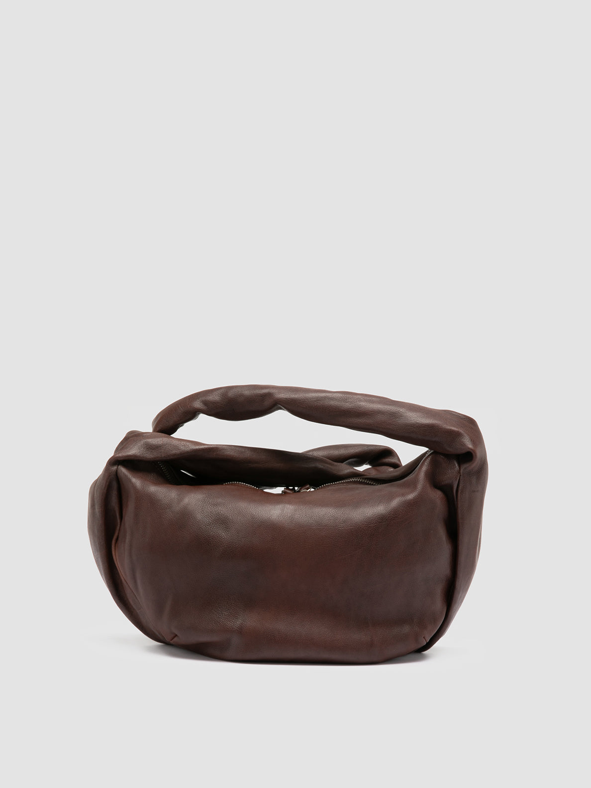 The Bolina 046 crossbody bag in brown leather presents a relaxed silhouette with a draped shoulder strap. The design emphasises minimalism and functionality, offering a spacious interior with a double-zip closure.