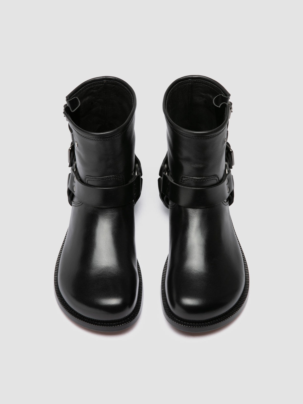 The Emerald 016 boots in black leather feature a pull-on silhouette with harness-inspired straps and metal hardware for a refined yet rugged aesthetic. A sturdy rubber-injected sole ensures durability.