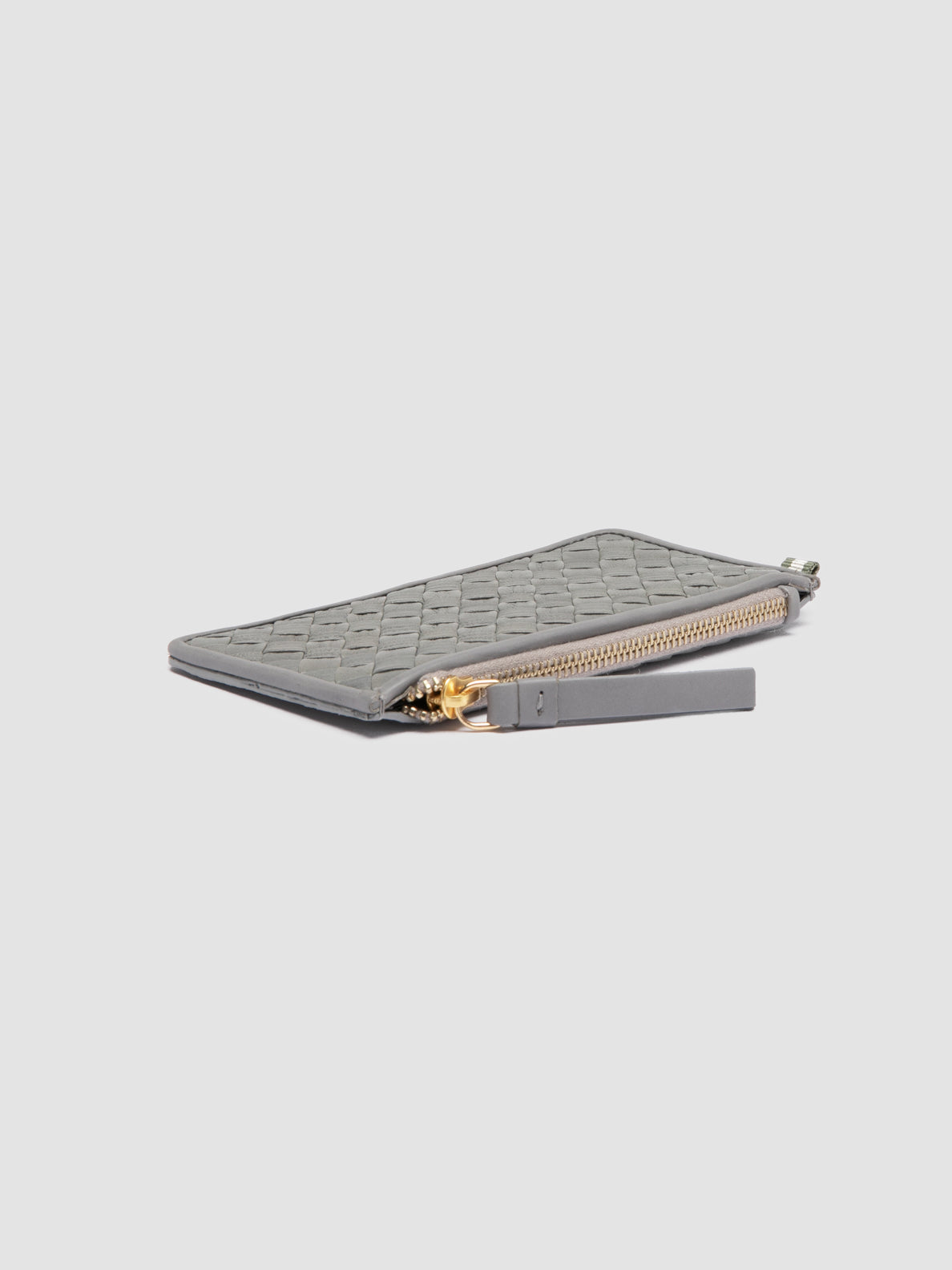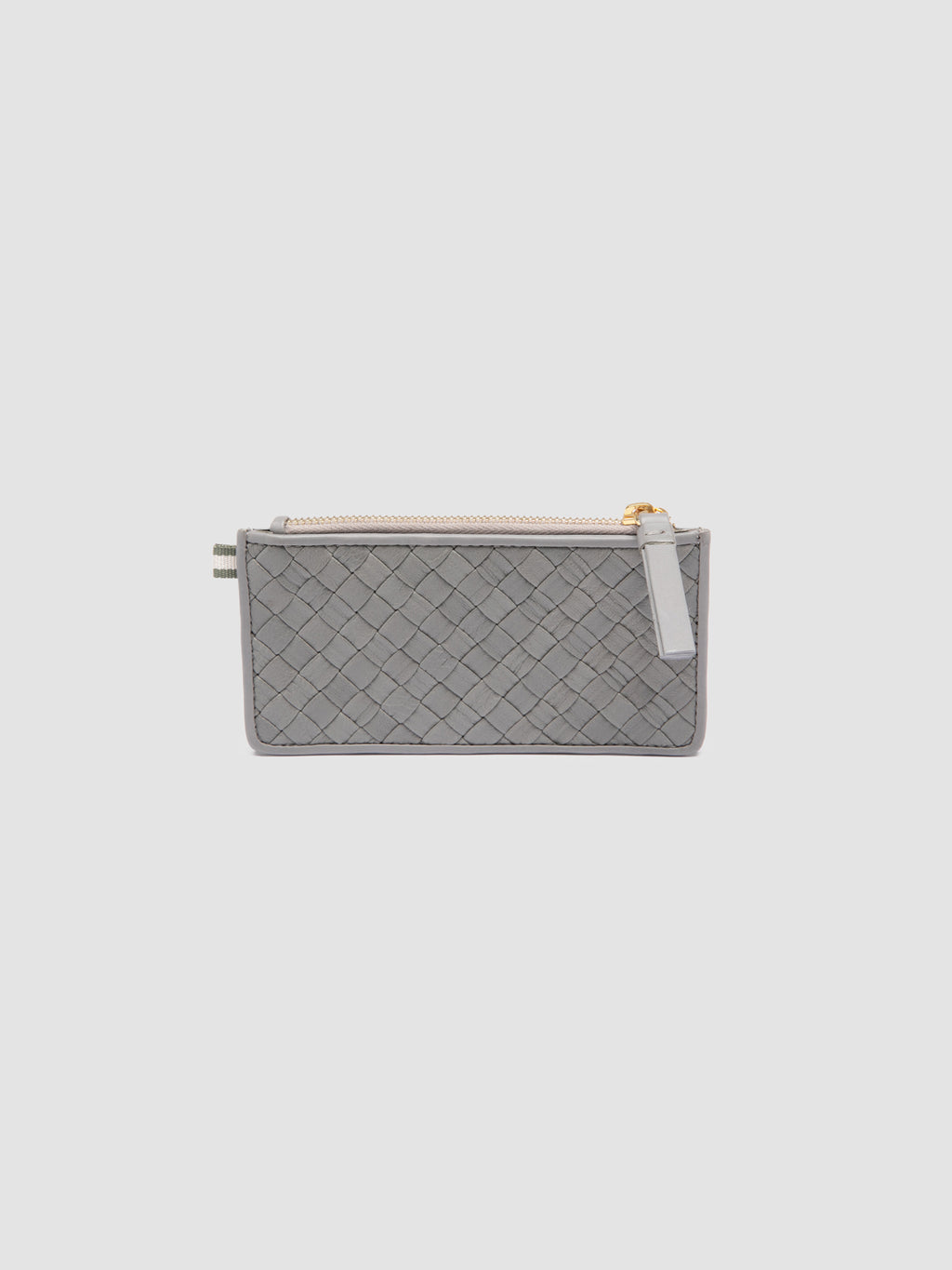 Made entirely by hand by our skilled craftsmen our Juliet card holder stands out thanks to its woven design in fine light blue leather. It features a gold-tone metal zip-fastened compartment six card slots logo lettering printed at front and our signature grosgrain loop tab at the side.