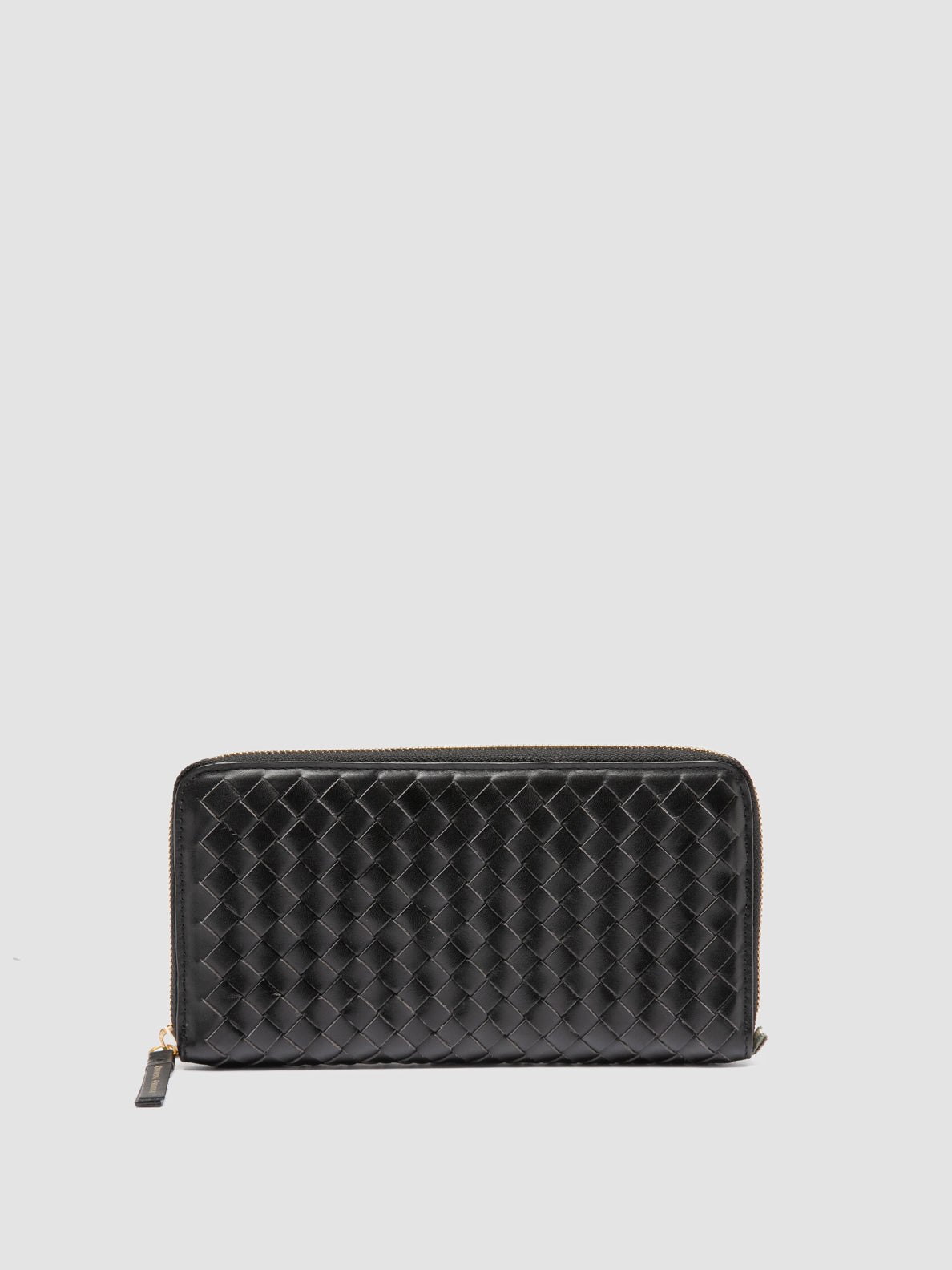 With a handwoven black leather design, the Juliet 201 wallet features a zip-around closure, multiple card slots, an open compartment and a central zipped pocket for effortless organisation. The gold-tone logo adds a distinctive finish.