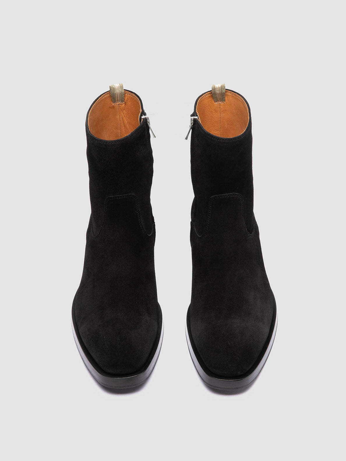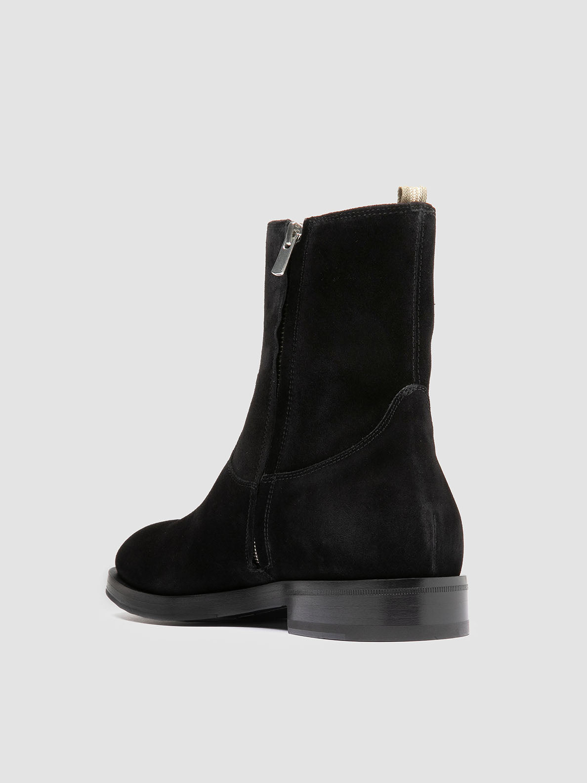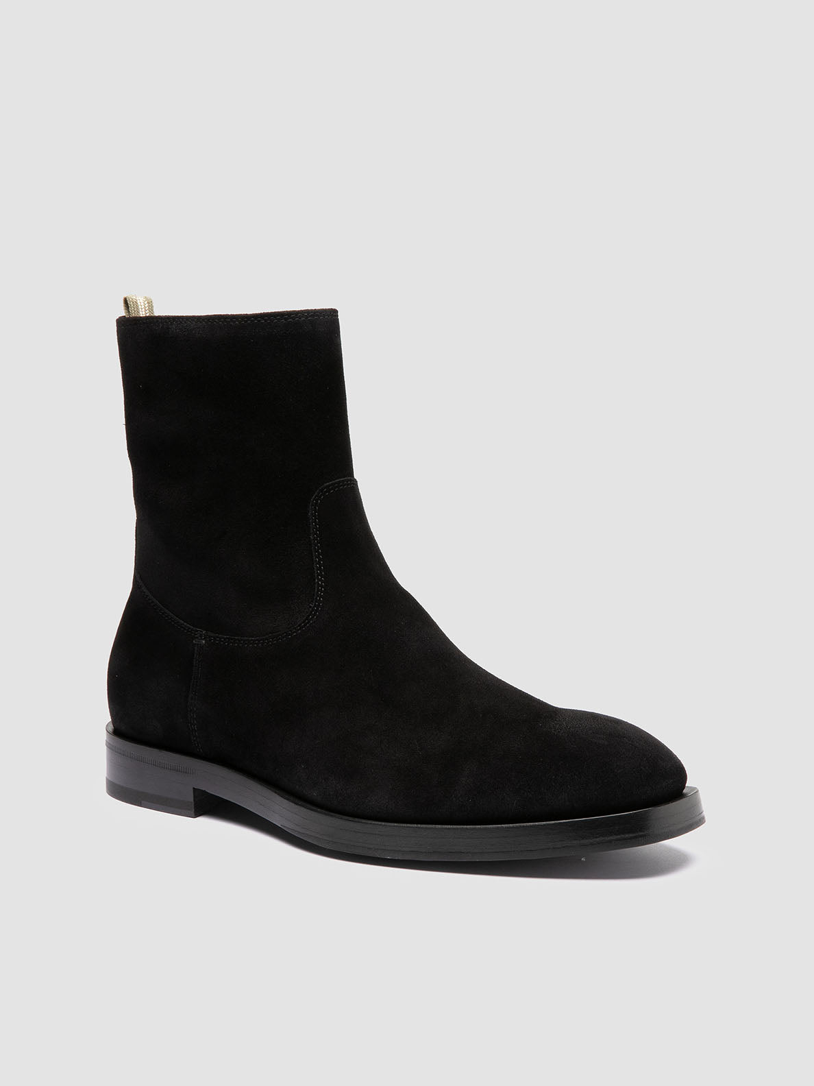 The Ortega 002 boots are handcrafted from soft black suede, blending modern elegance with comfort. They feature a sleek mid-calf silhouette, a side zip, a squared toe and a leather sole with rubber injection.